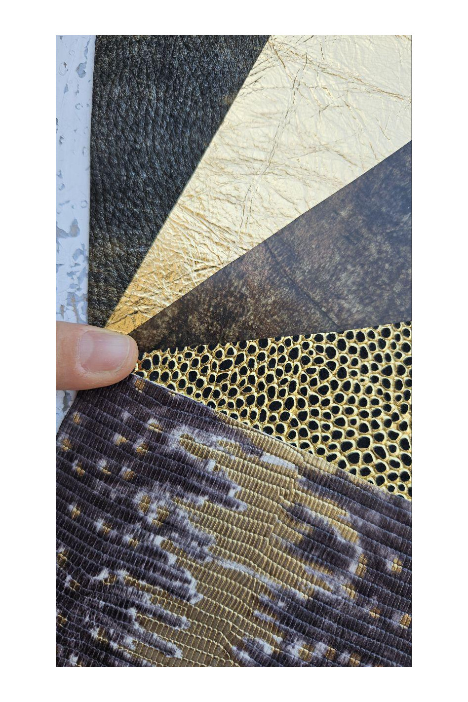 5 Selected leather scraps, GOLD BRONZE tones, printed and metalic printed, mix selection leather remnants as per pictures