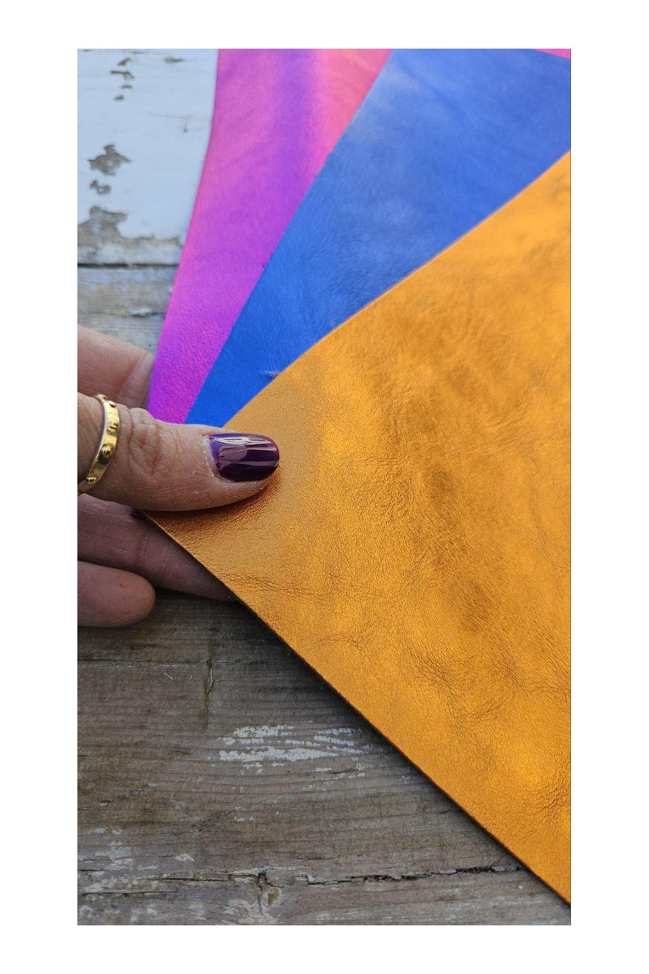 Calf metallic leather pieces, in 3 different bright and shiny colors, blue, fuchsia and orange tones. Refined look . Cutouts of genuine Italian leather.