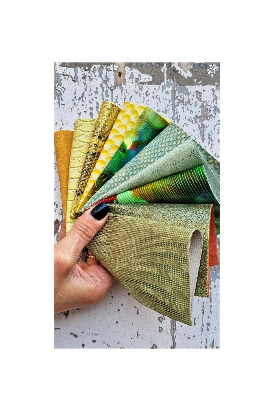 Gorgeous fancy leather scraps yellow and green tones!