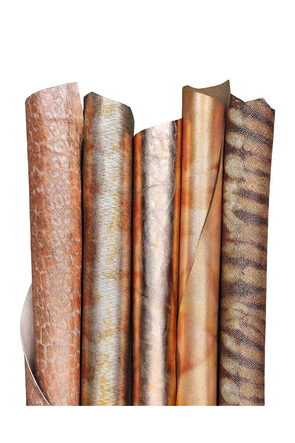 Outstanding bundle of 5 leather skins, metallic printed matching goatskins as per pictures, ideal for crafting.