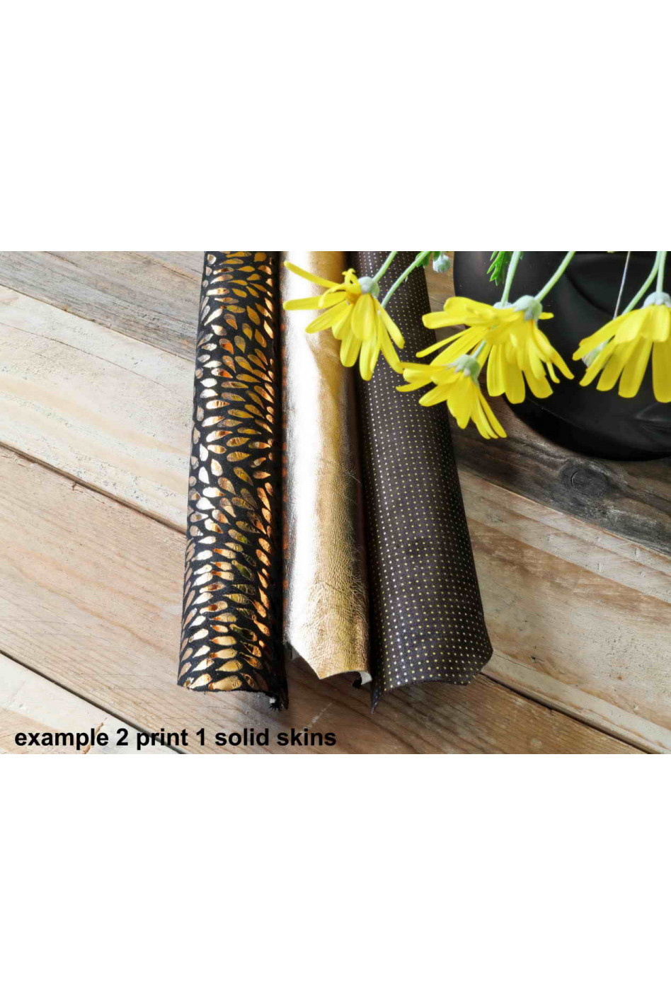 -2 solid color hides (smooth or grainy, or suede, or metallic) and 1 printed hide (metallic or not),