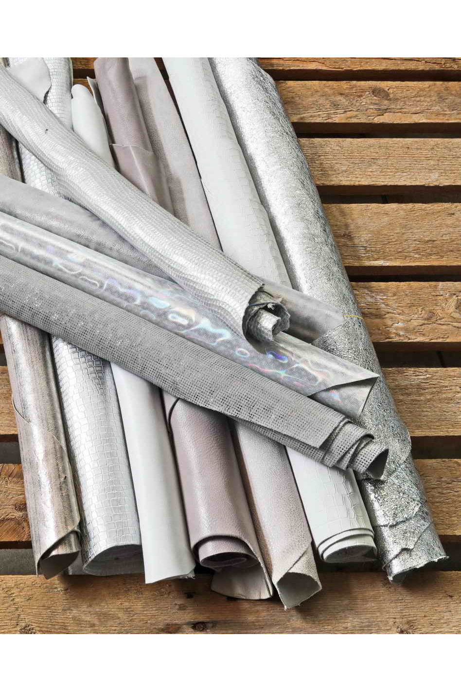 Full leather skins white and silver color with different finishings, patterns and solid colors. Genuine Italian leather. The smallest approximate size s 18 x 20 inches (4/5 sqf).