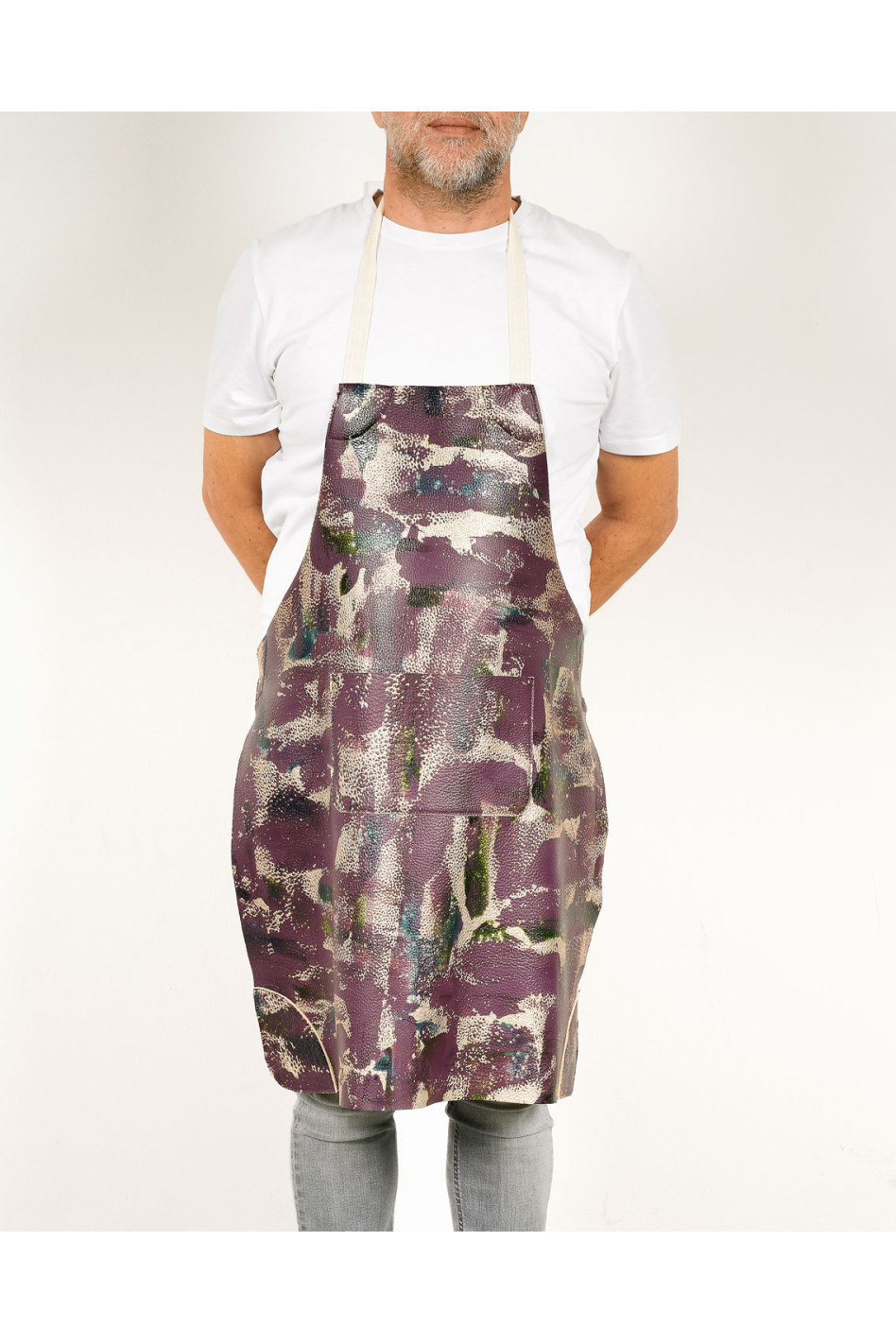 Questo grembiule in pelle dipinta a mano è un pezzo unico, creato per chi cerca un accessorio funzionale ed elegante.