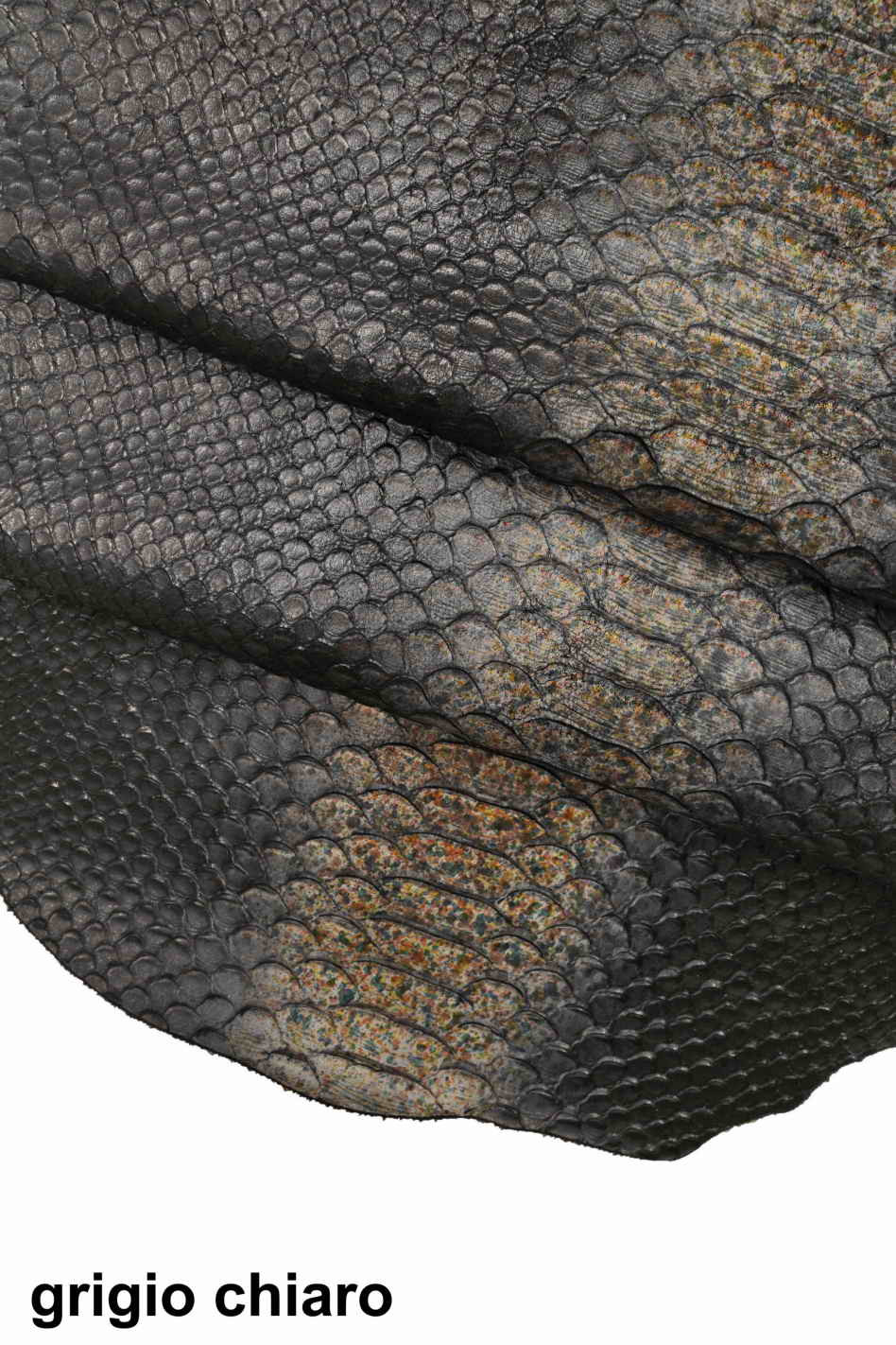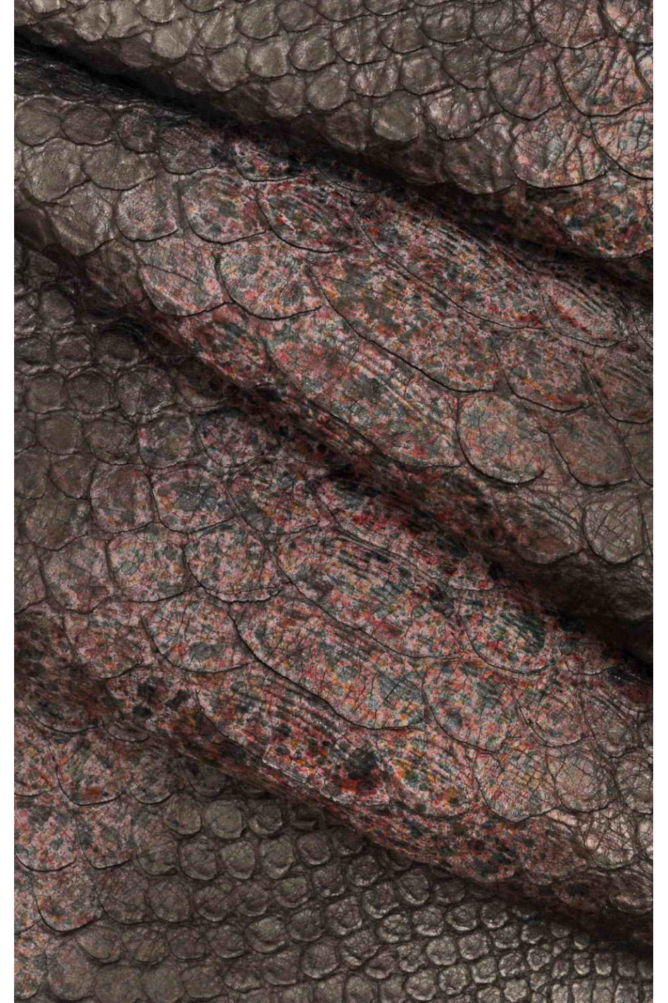 Pellame italiano, mezzo vitello nero con stampa squama serpente incisa, decorata a mano con strisce di un colore e schizzi multicolor, semi lucido, morbido, look sportivo.