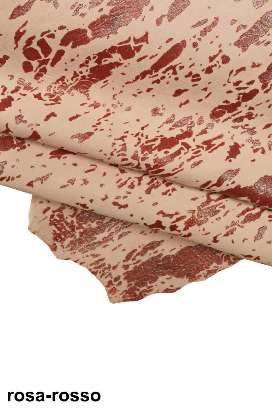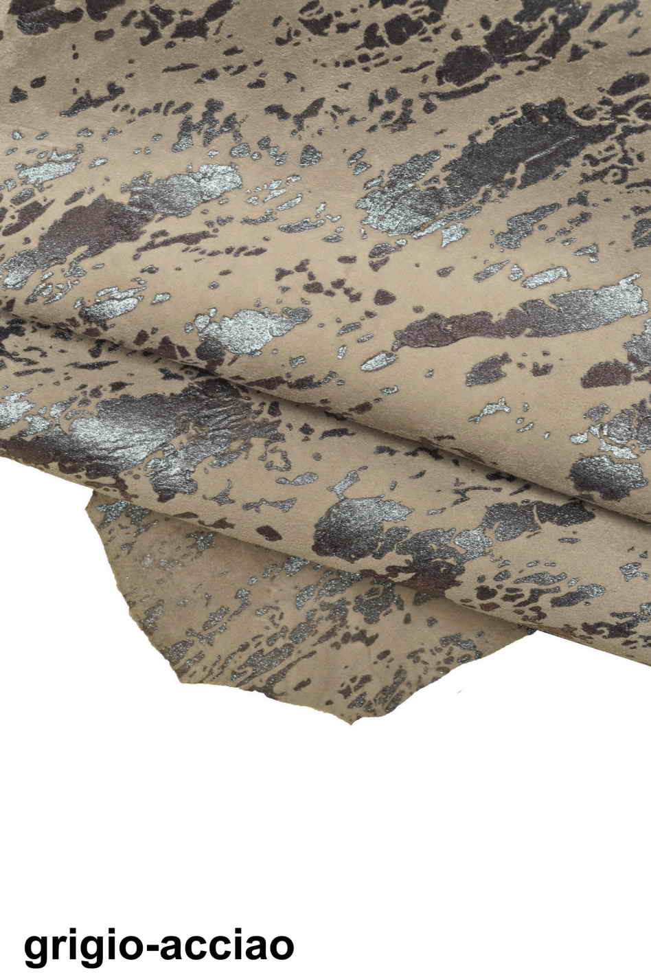 CAPRA scamosciata stampata, pelle effetto camoscio con disegno schizzo glitterato, pellame morbido con stampa astratta