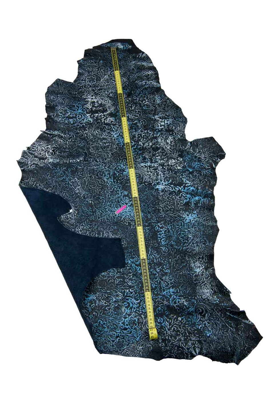 Favolosa pelle di capra blu notte con stampa a fiori e decorazioni celeste e bianche per l'artigianato.