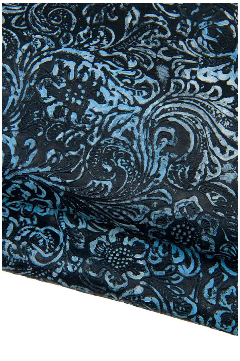 Pelle stampa FLOREALE, pellame blu notte a fiori con decorazione celeste bianco, capra per hobbisti