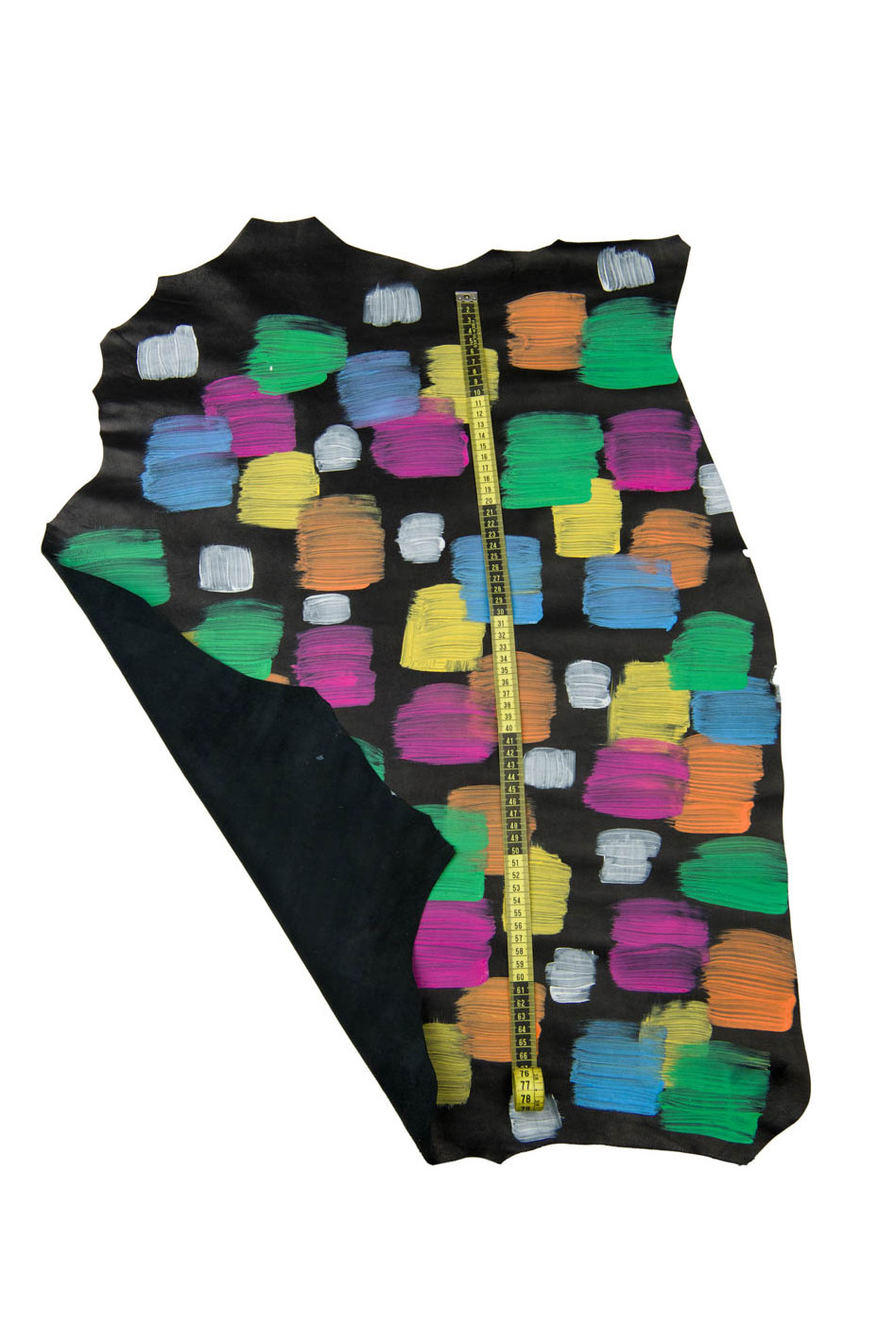 Pelle mullticolor DIPINTA A MANO, capra con stampa pennellate su base nero, morbido, pellame particolare per hobbisti
