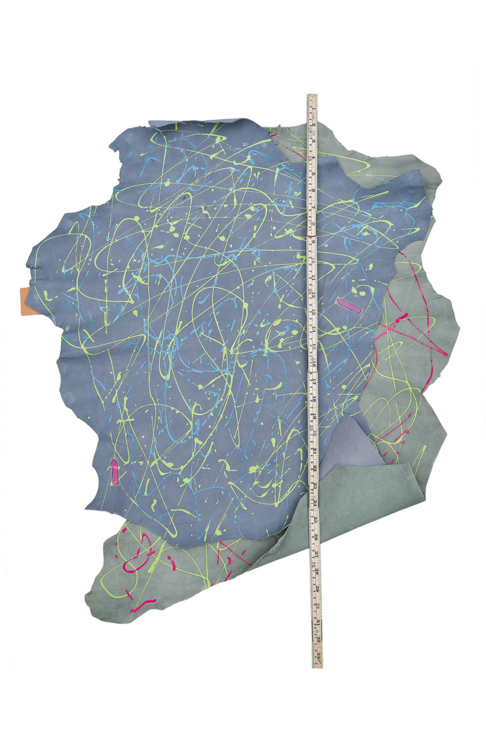 Introvabili pelli grigio e verde, capra scamosciata con fantasia pollock - schizzo multicolor, pellami per hobbisti.