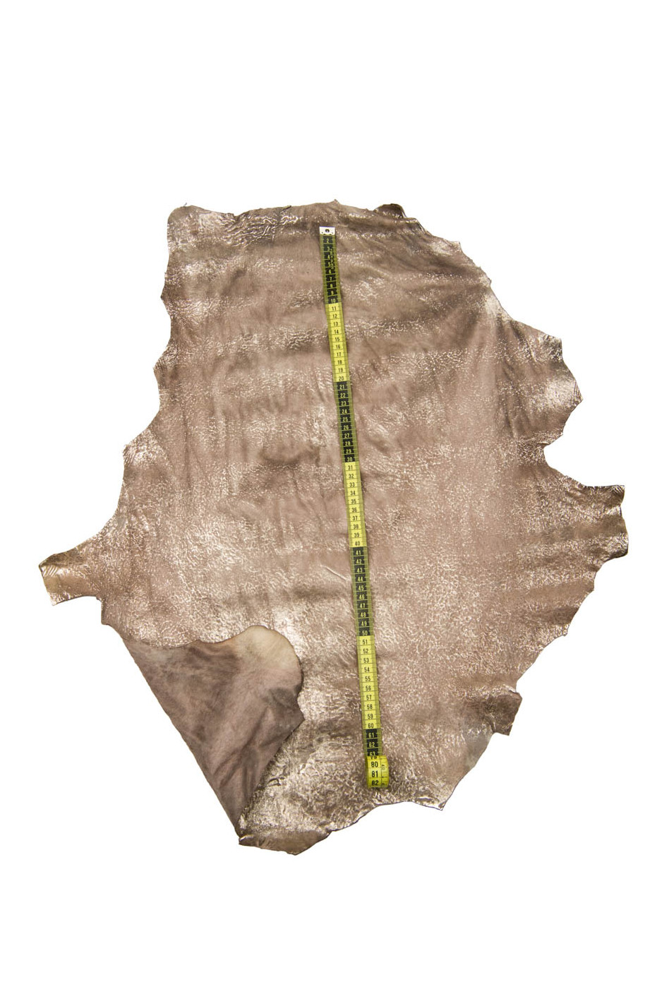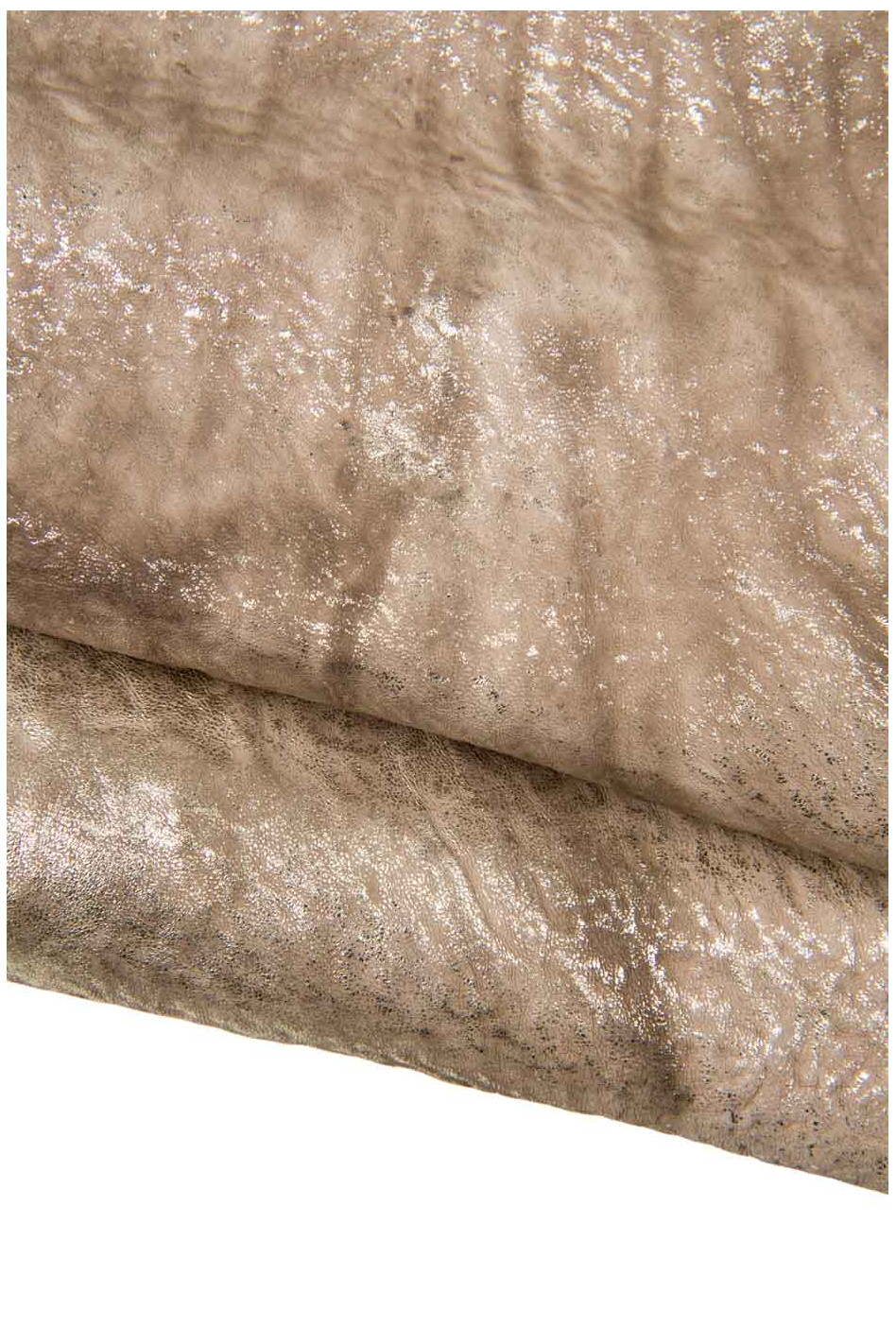 Stupenda pelle sportiva laminata, capra lavata stropicciata tortora con lamina platino, pellame morbido per hobbisti.