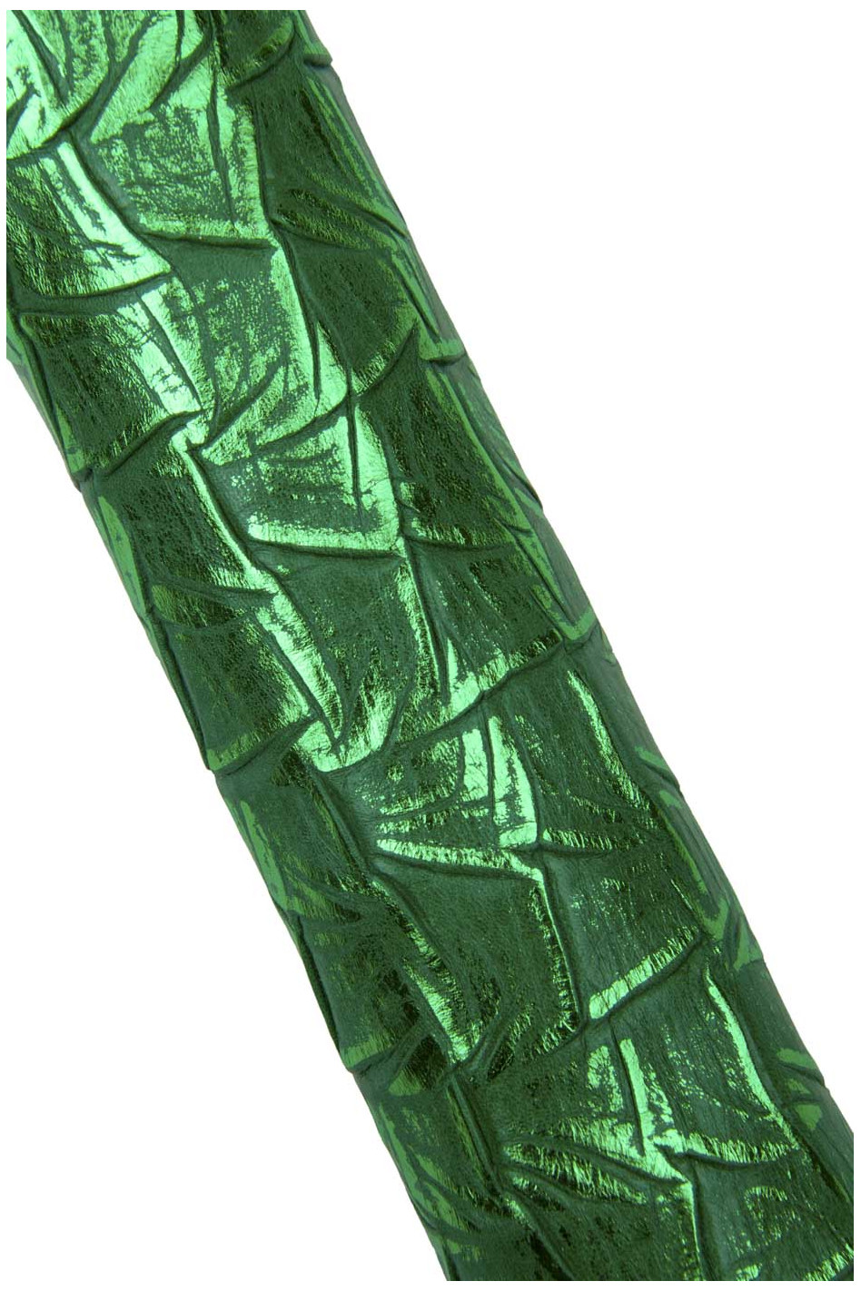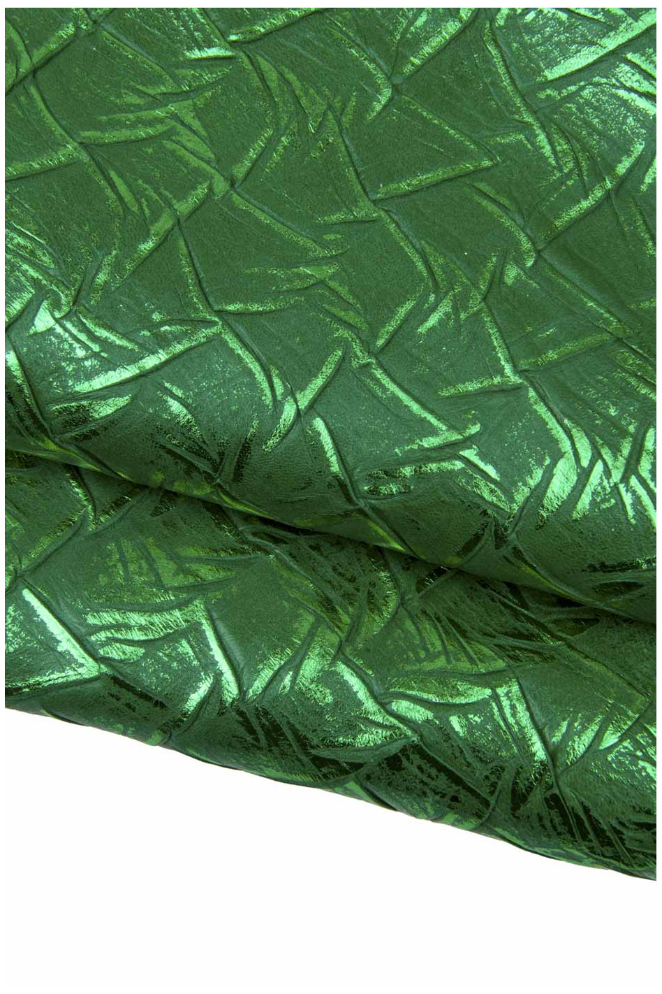 Particolare pelle laminata verde stampa simil coccodrillo, pellame capretto metallizzato morbidissimo per il fai da te.
