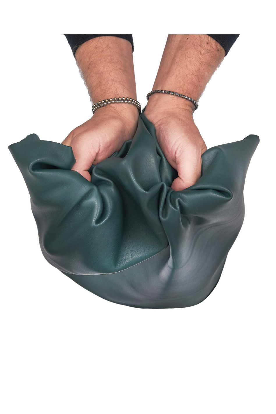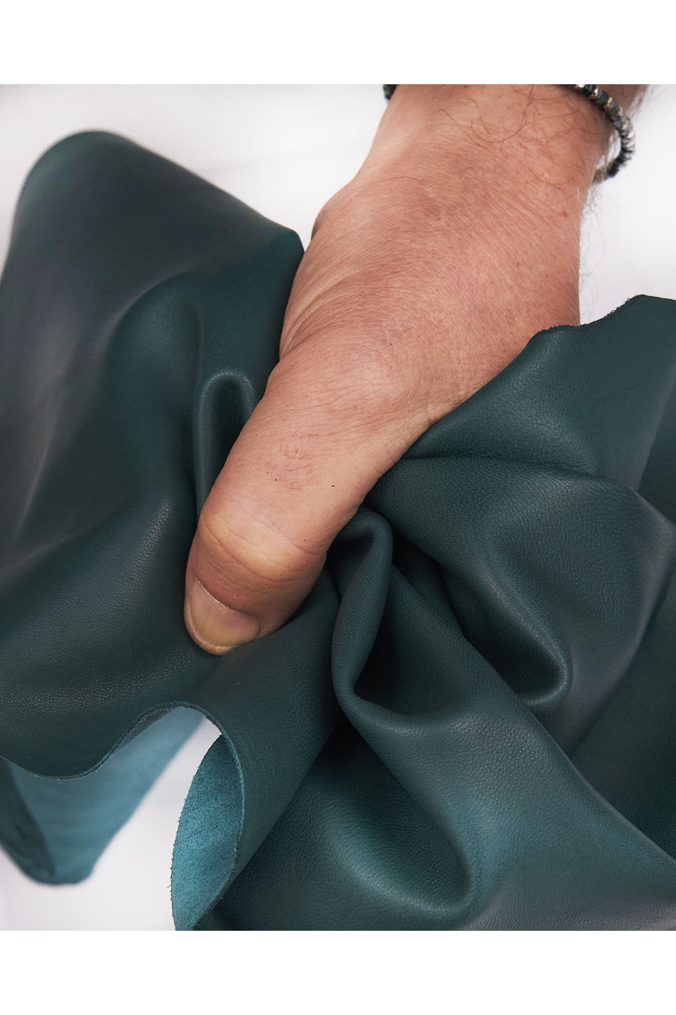Incredibile pelle di nappa su agnello verde petrolio, super morbida, liscia e semi lucida per abbigliamento.