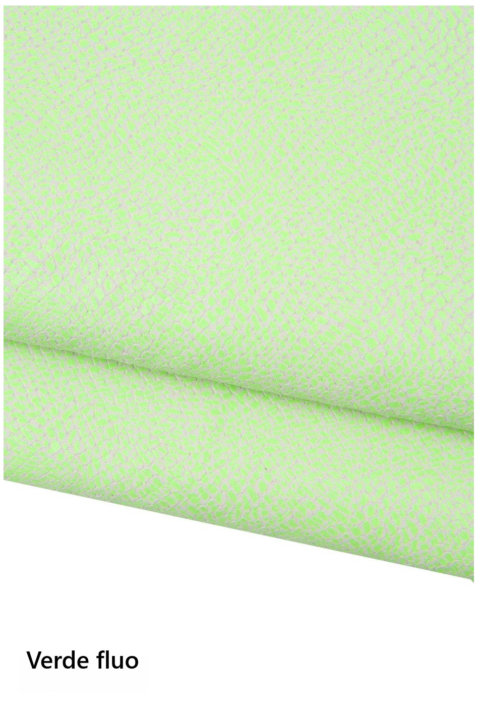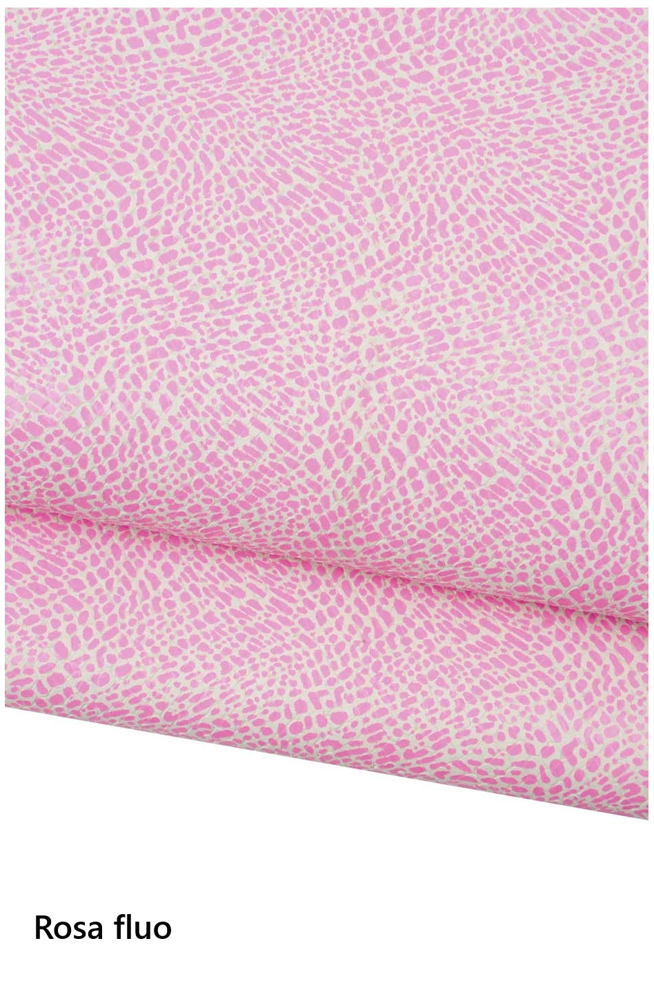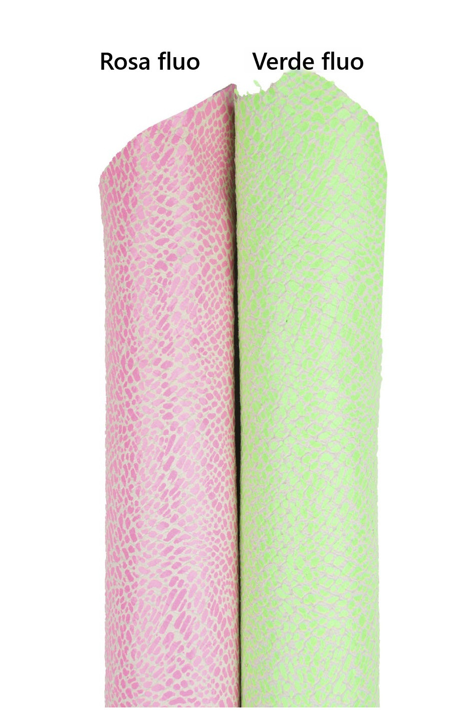 Originalissima pelle stampa mini ghepardo fluorescente rosa - verde, pellame stampa pitone motivo animalier fosforescente, capra lucida per fai da te.