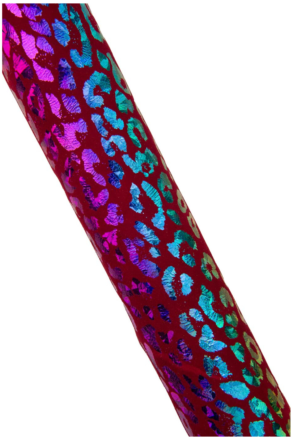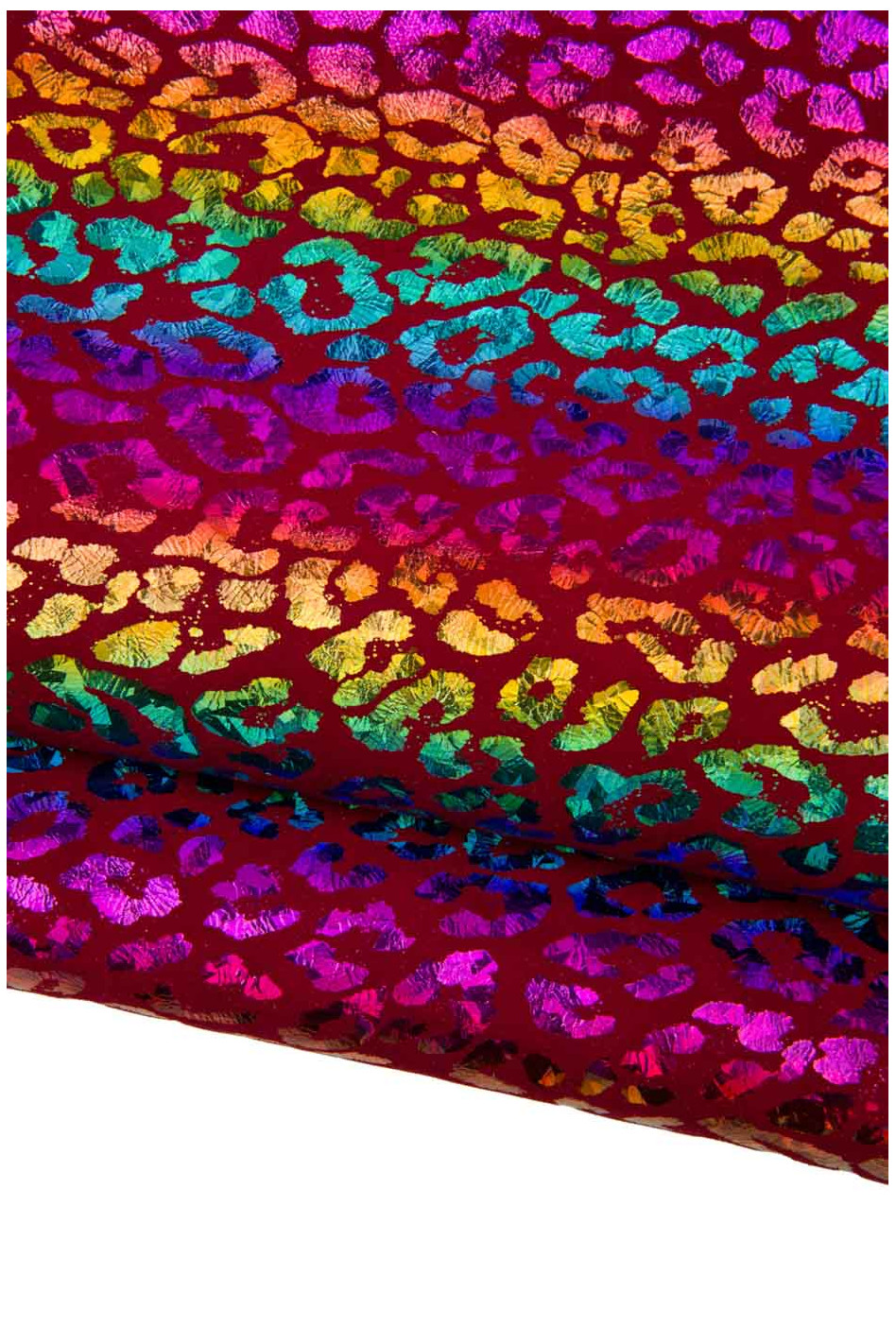 Fantastica pelle di capra scamosciata stampa ghepardo, pellame bordeaux laminato motivo leopardo multicolor - arcobaleno, oleografico, morbido. Materiale metallizzato oleografico ideale per hobbisti e artigiani.