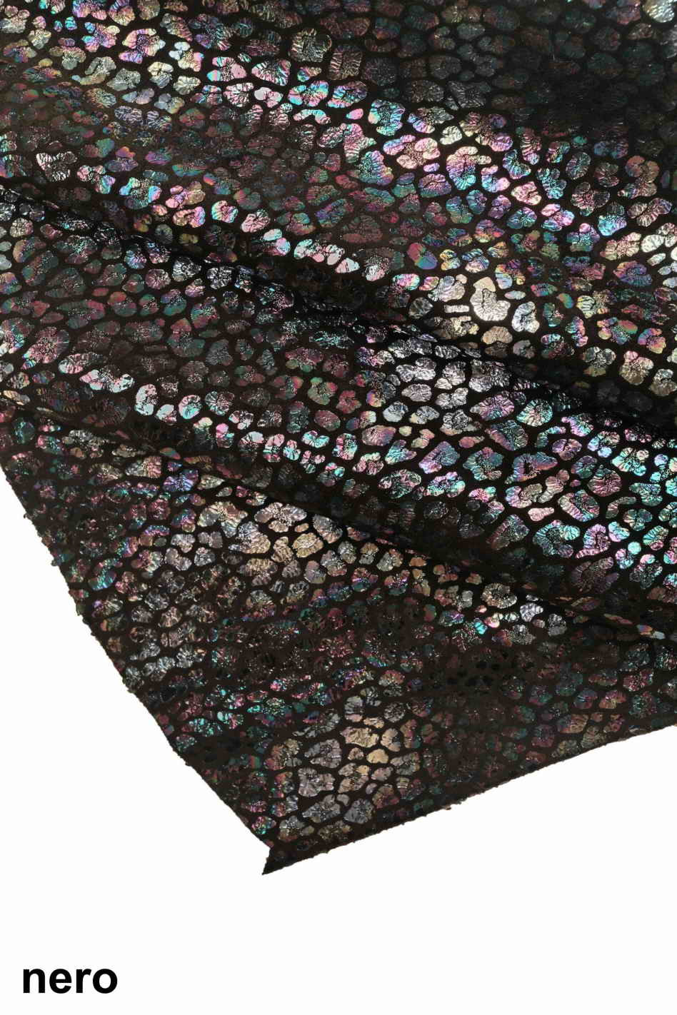 Stupenda pelle leopardo oleografico - pellame vitello camoscio nero stampa laminata animalier mini ghepardo iridescente. Ideale per hobbisti e artigiani.