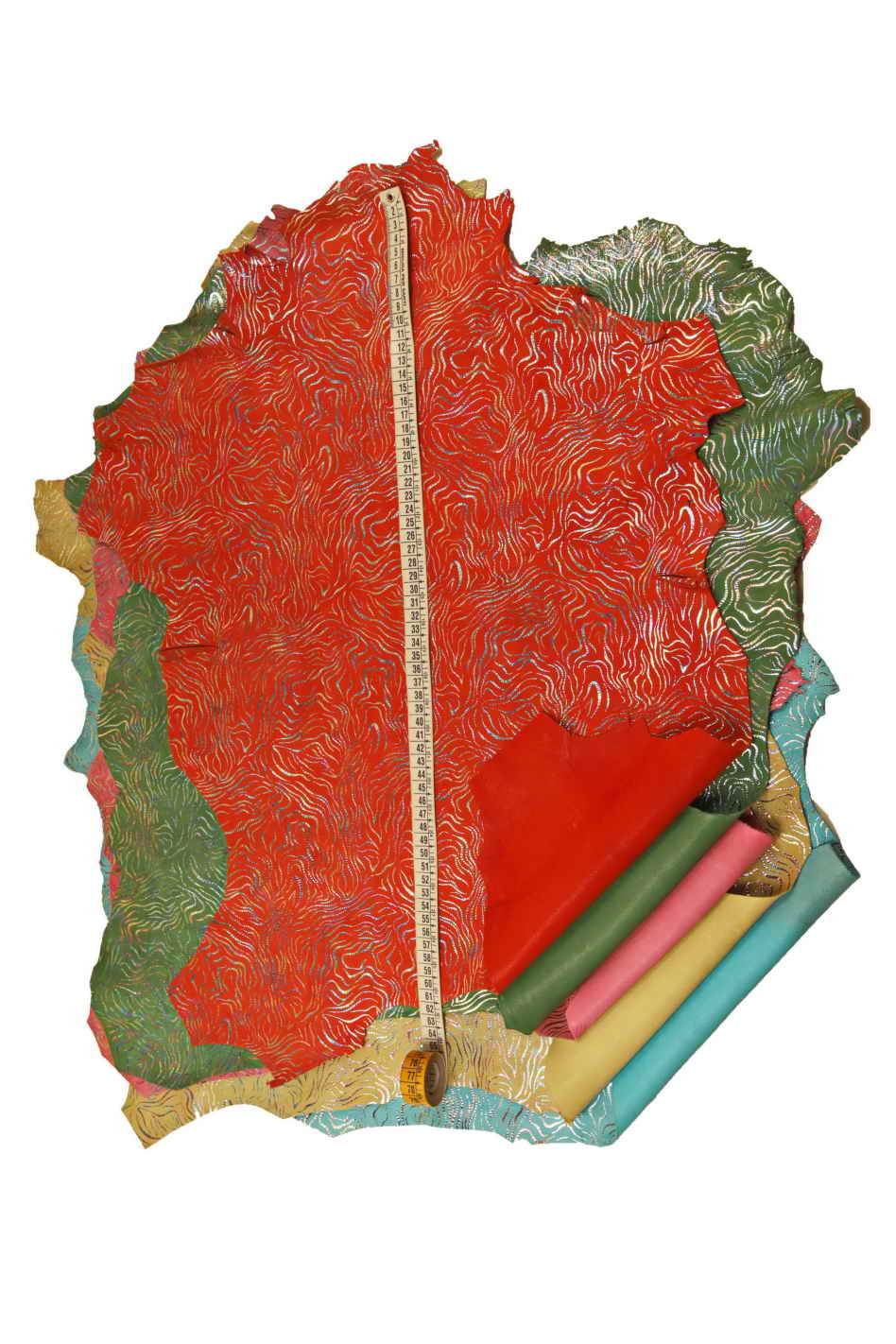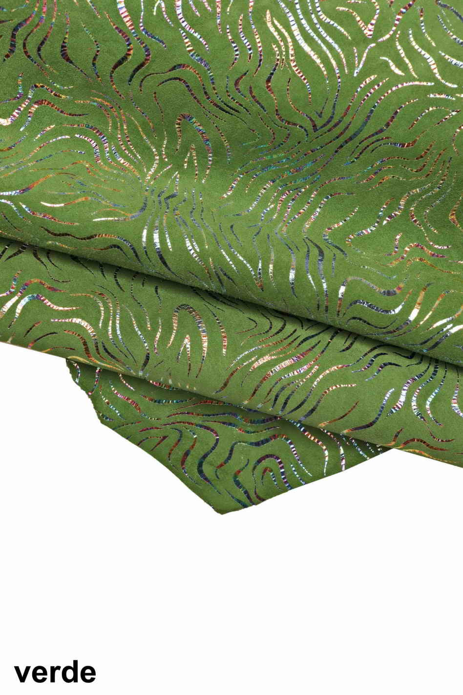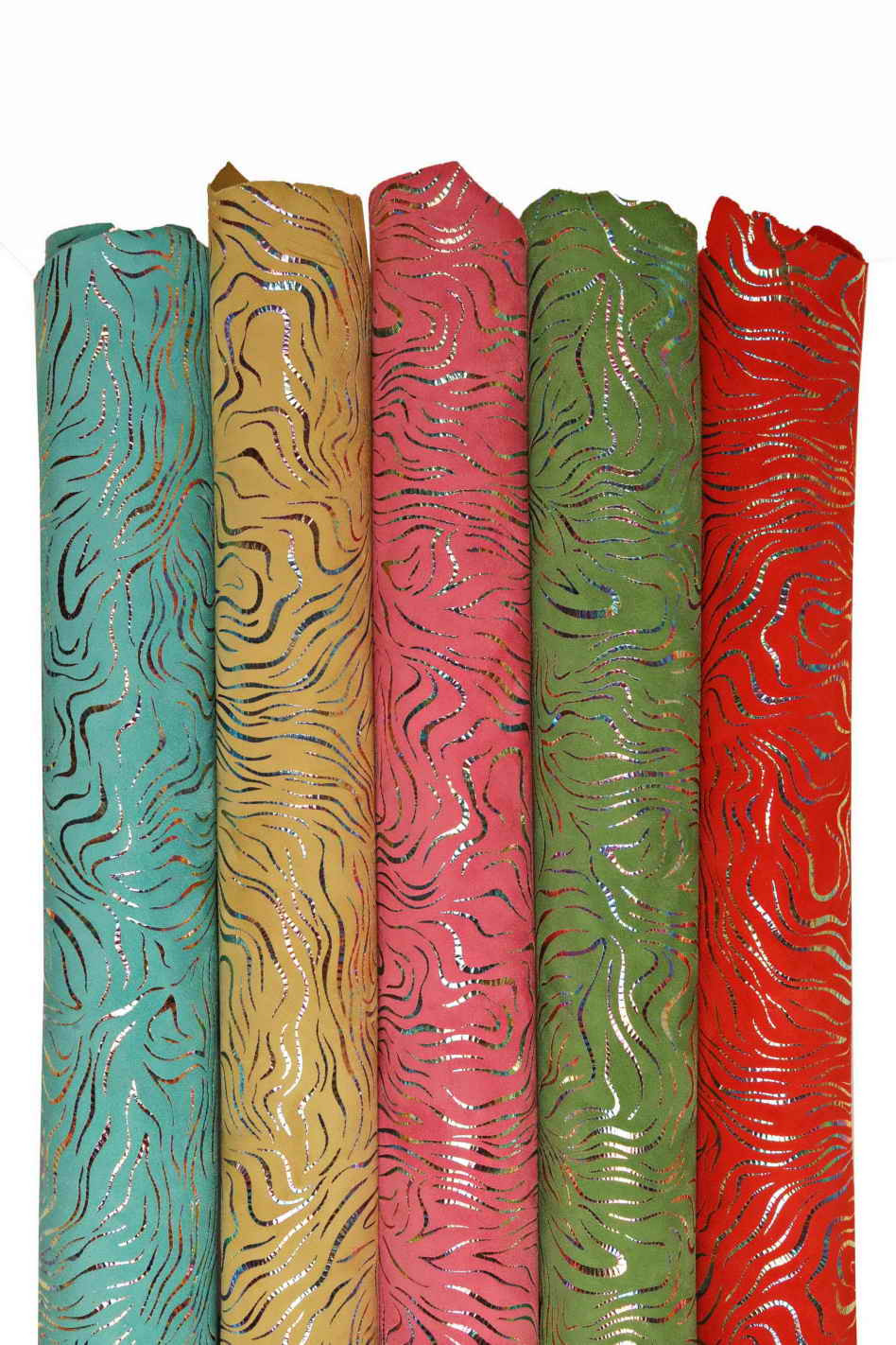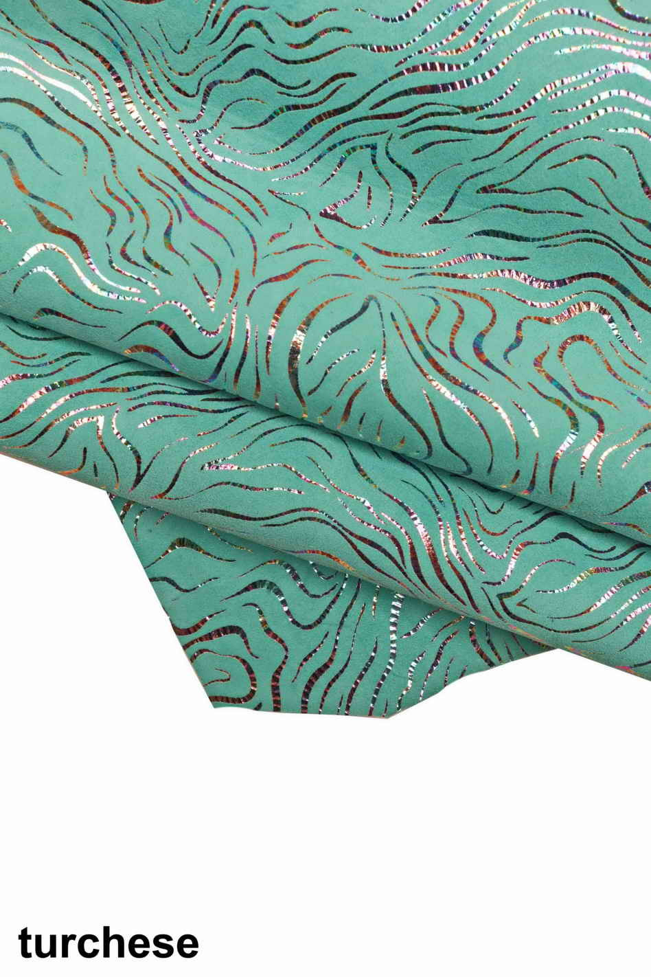 Favolosa pelle scamosciata con stampa zebra e lamina oleografica nei colori turchese, giallo, rosa, verde e rosso.