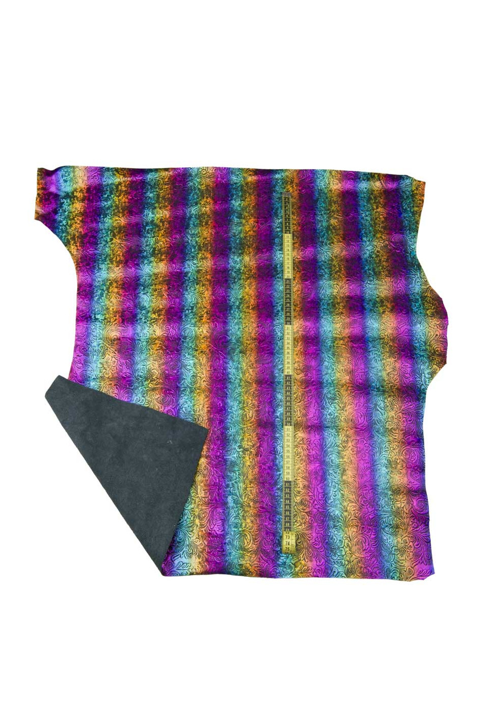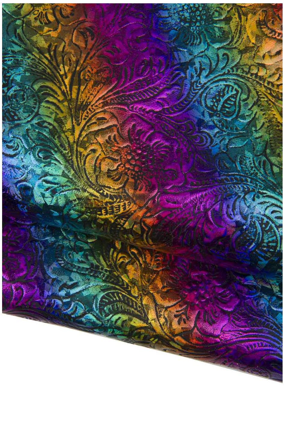 Meravigliosa pelle floreale multicolor, vitello laminato iridescente effetto a righe "rainbow", pellame metallizzato morbido.