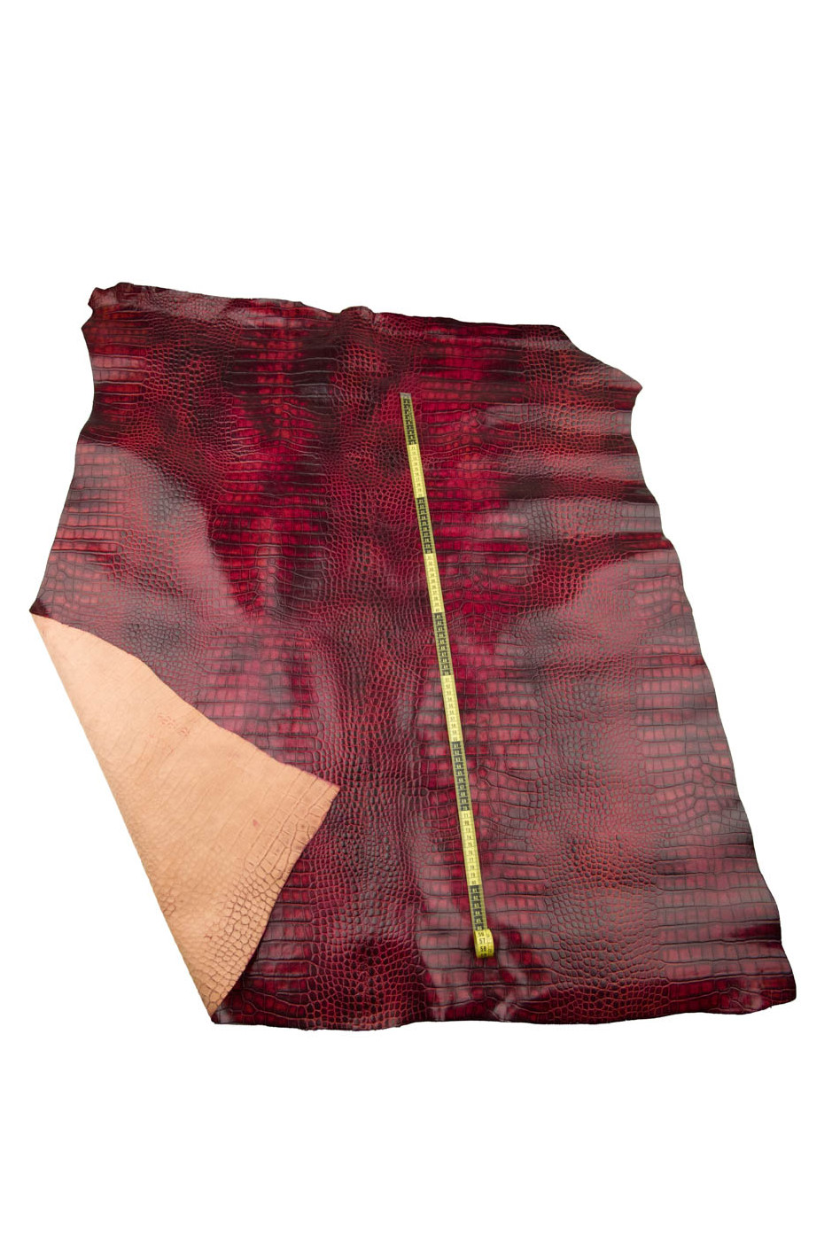 Meraviglioso pellame stampa coccodrillo rosso scuro, vitello lucido motivo alligatore, pelle sfumata, tempra standard. Perfetta per eleganti creazioni artigianali.