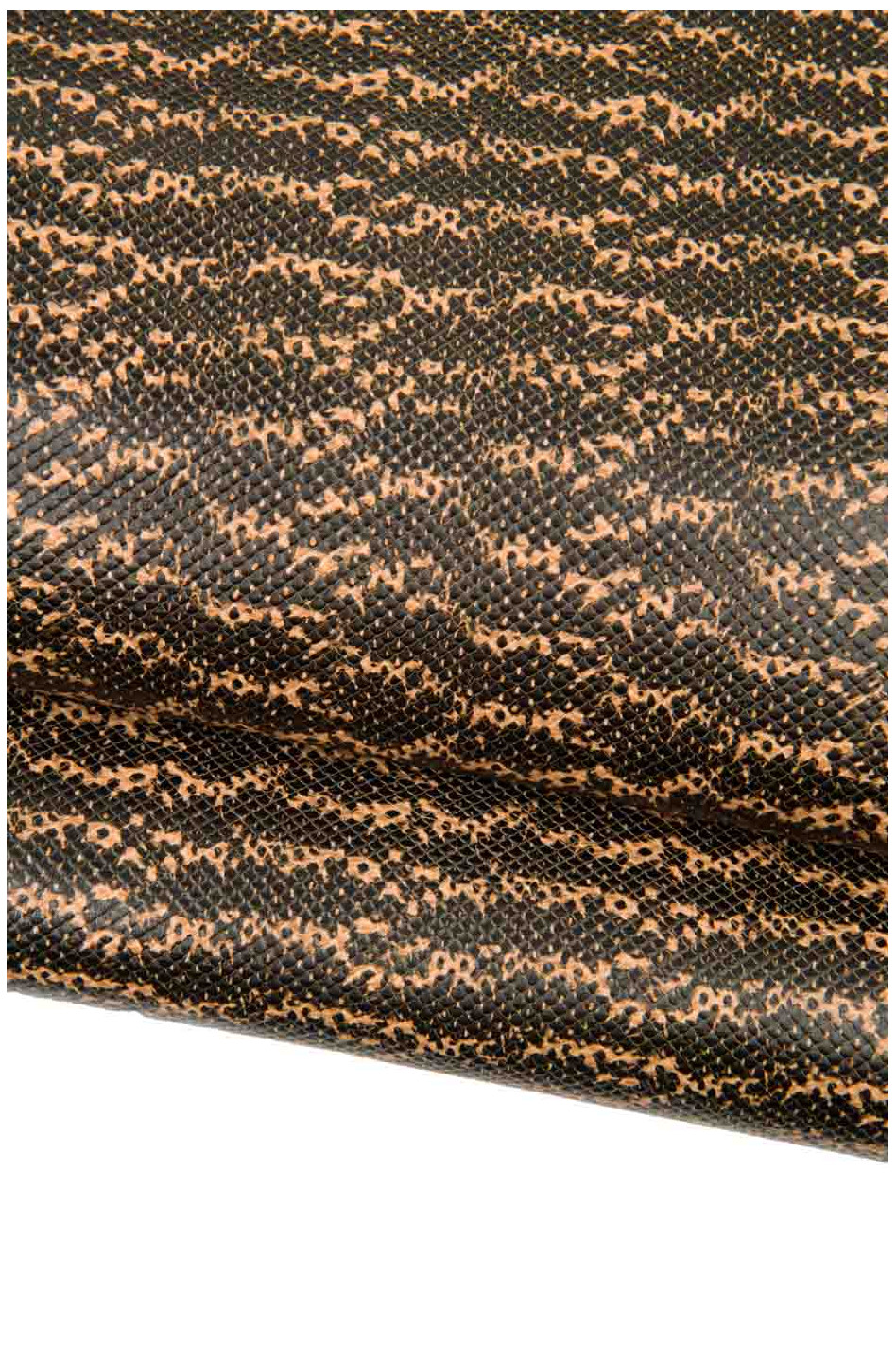 Stupendo pellame in vitello stampa pitone nei toni marrone e cuoio, superficie con disegno rettile marcato, ideale per l'artigianato.