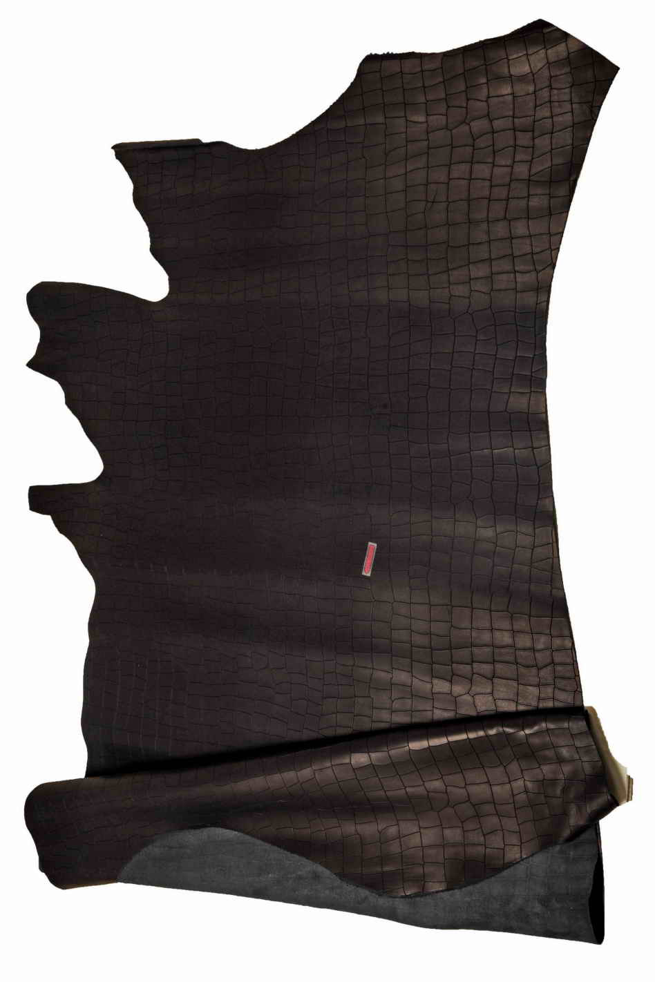 Particolare pellame di vitello blu notte con stampa coccodrillo intagliata, semi lucido, sportivo, morbidezza media.