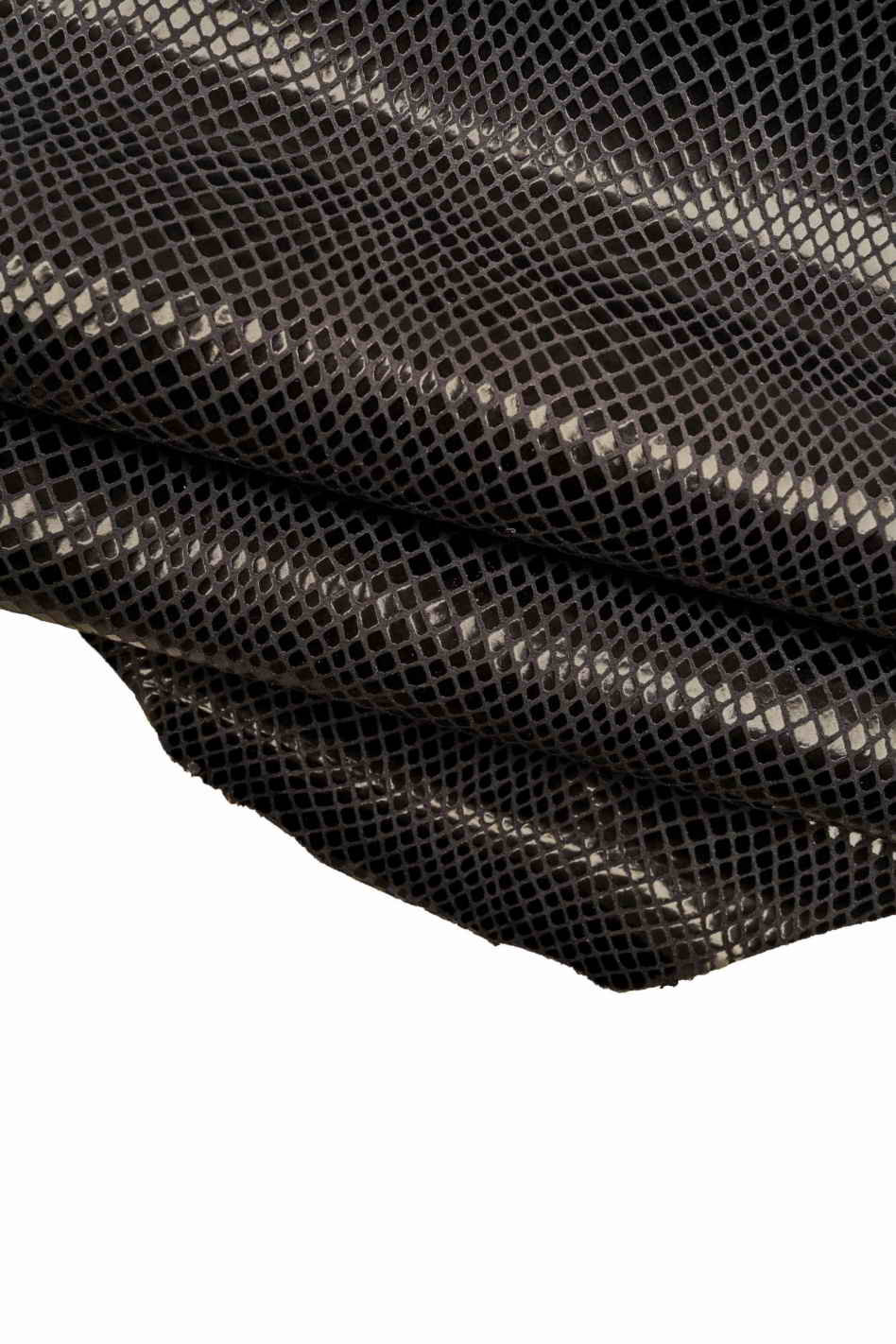 Originale pelle di capra con stampa serpente color grigio scuro e nero, lucida, morbida e sottile.