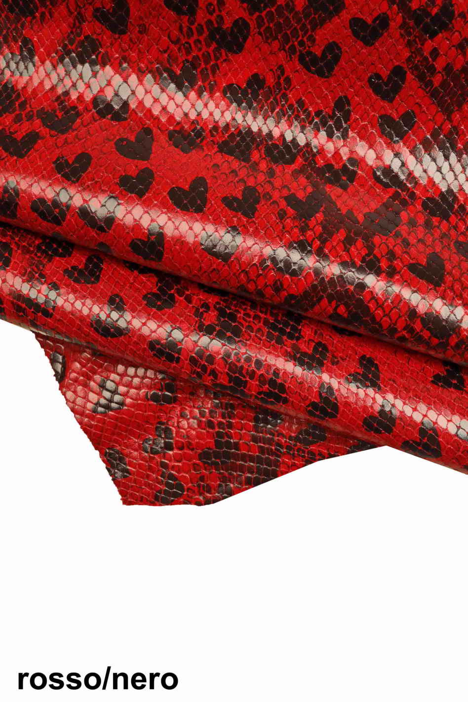 Pelle disegno CUORI, vitello stampato rettile rosso/nero e viola/verde, pellame lucido morbido stampa love