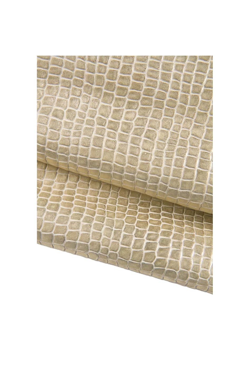 Elegante pellame platino stampato coccodrillo, vitello metallizzato effetto satinato, pelle laminata morbida motivo cocco.
