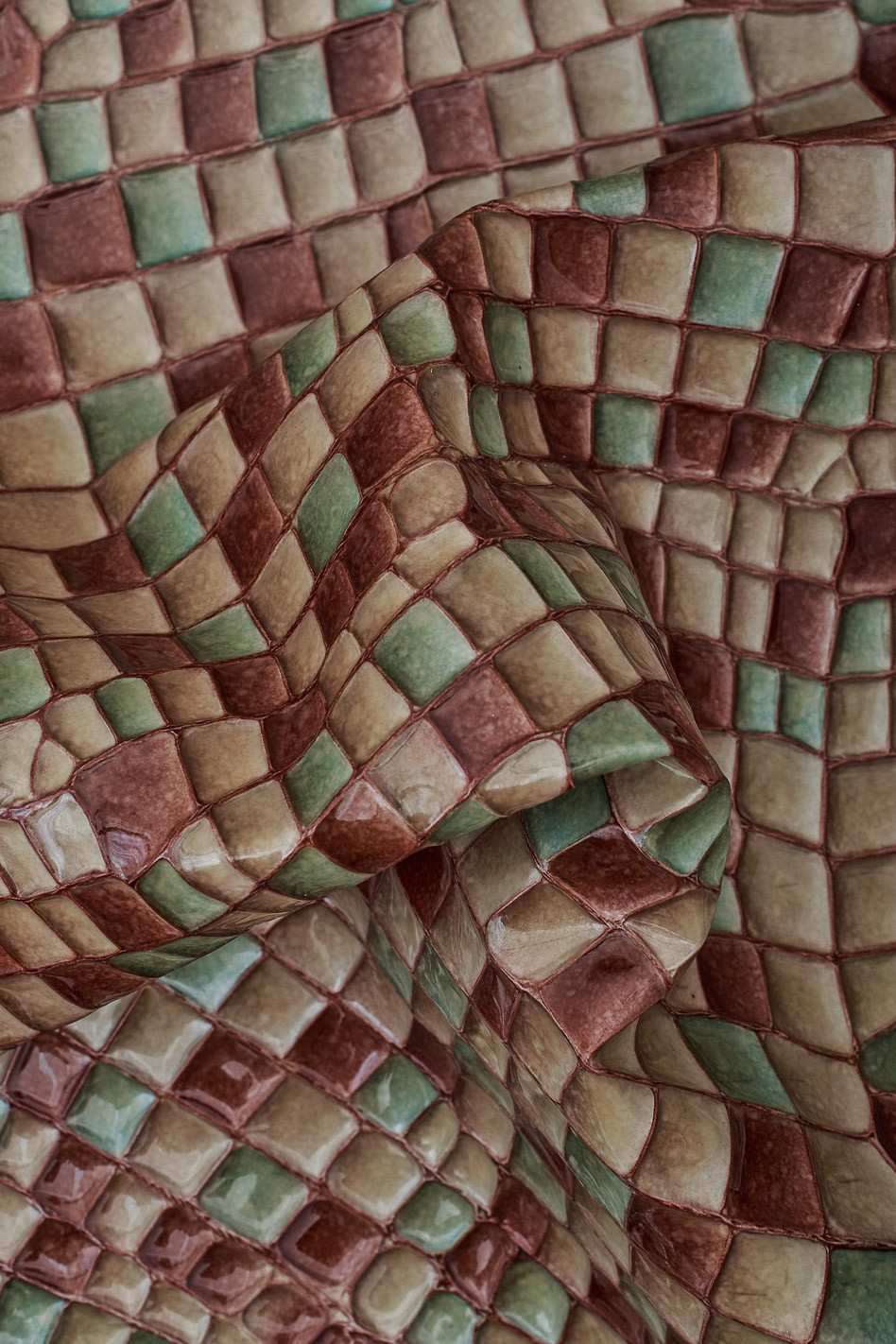 Favolosa pelle di vitello con stampa coccodrillo multicolor, lucida, morbidezza media.