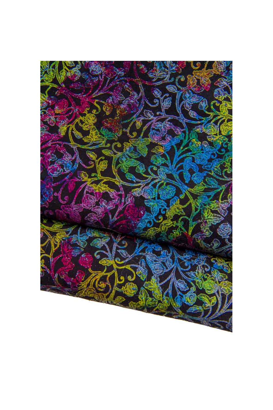 Originale pelle scamosciata nera con stampa multicolor a fiori, ideale per artigianato.