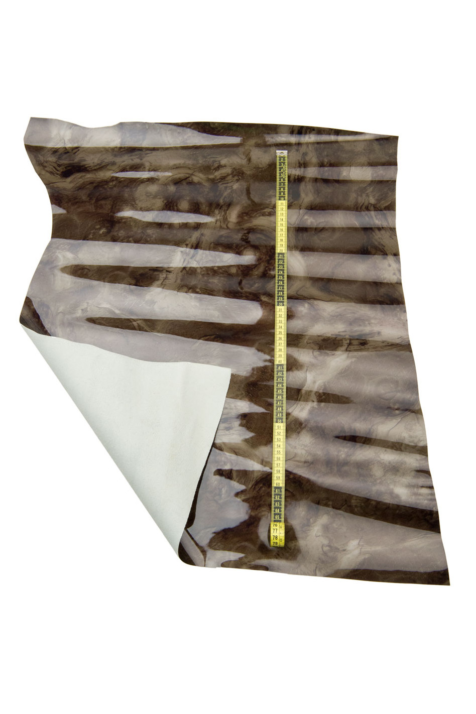 Bellissimo pellame verniciato marrone fango, vitello lucido stampa astratta, pelle vernice morbidezza media