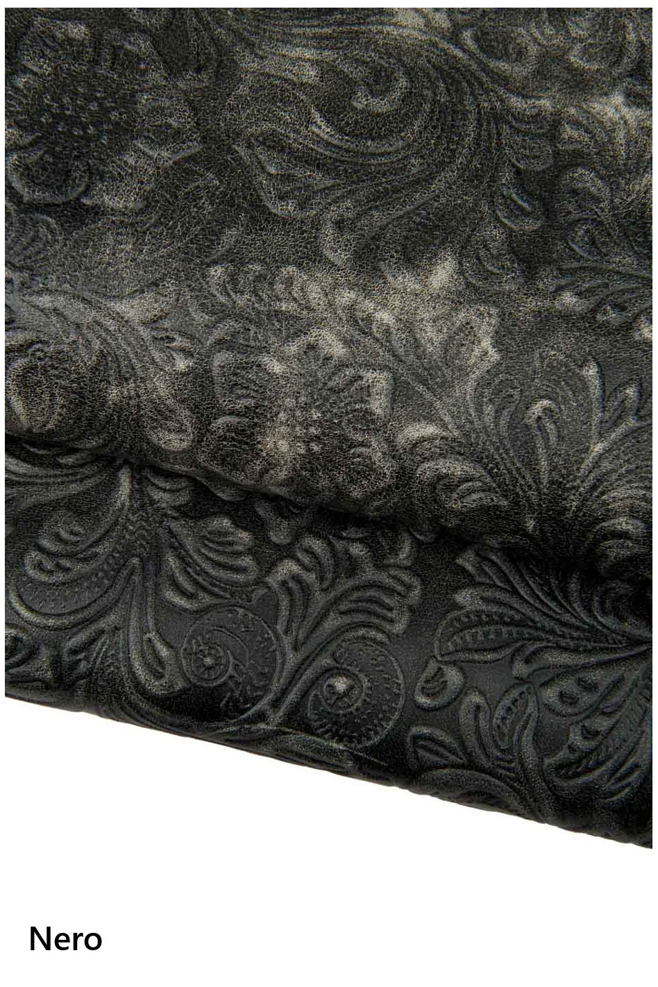 Pelle stampa FLOREALE grigio e nero, vitello invecchiato/consumato pelle CHARRO vintage effetto "sbiancato"