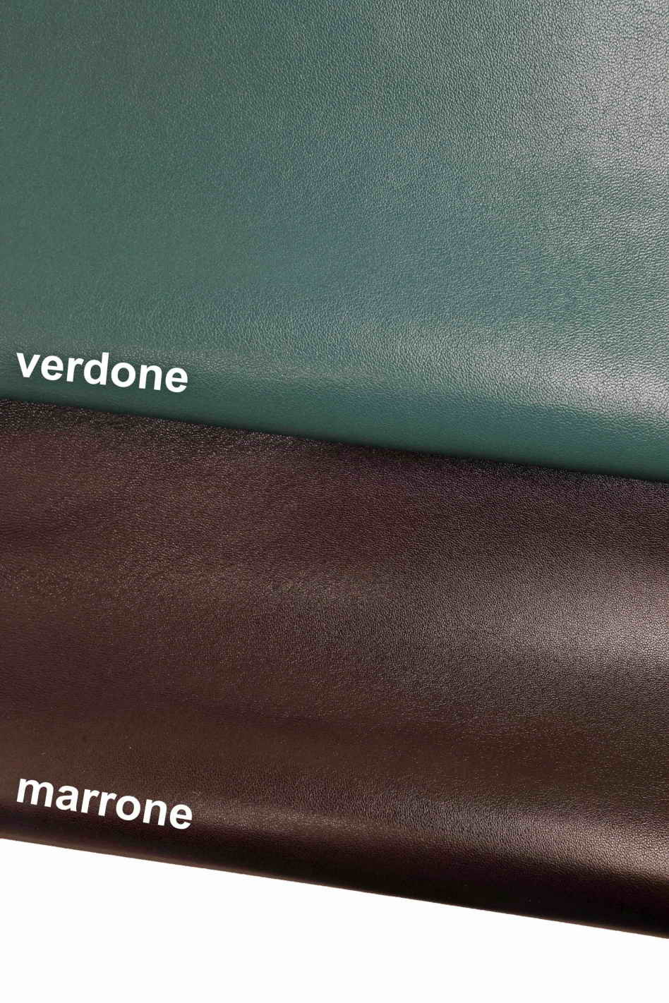 Pellame italiano, nappa tinta unita con grana piccola, lucida, super morbida, look classico-sportivo, 2 colori disponibili: verdone, marrone.
