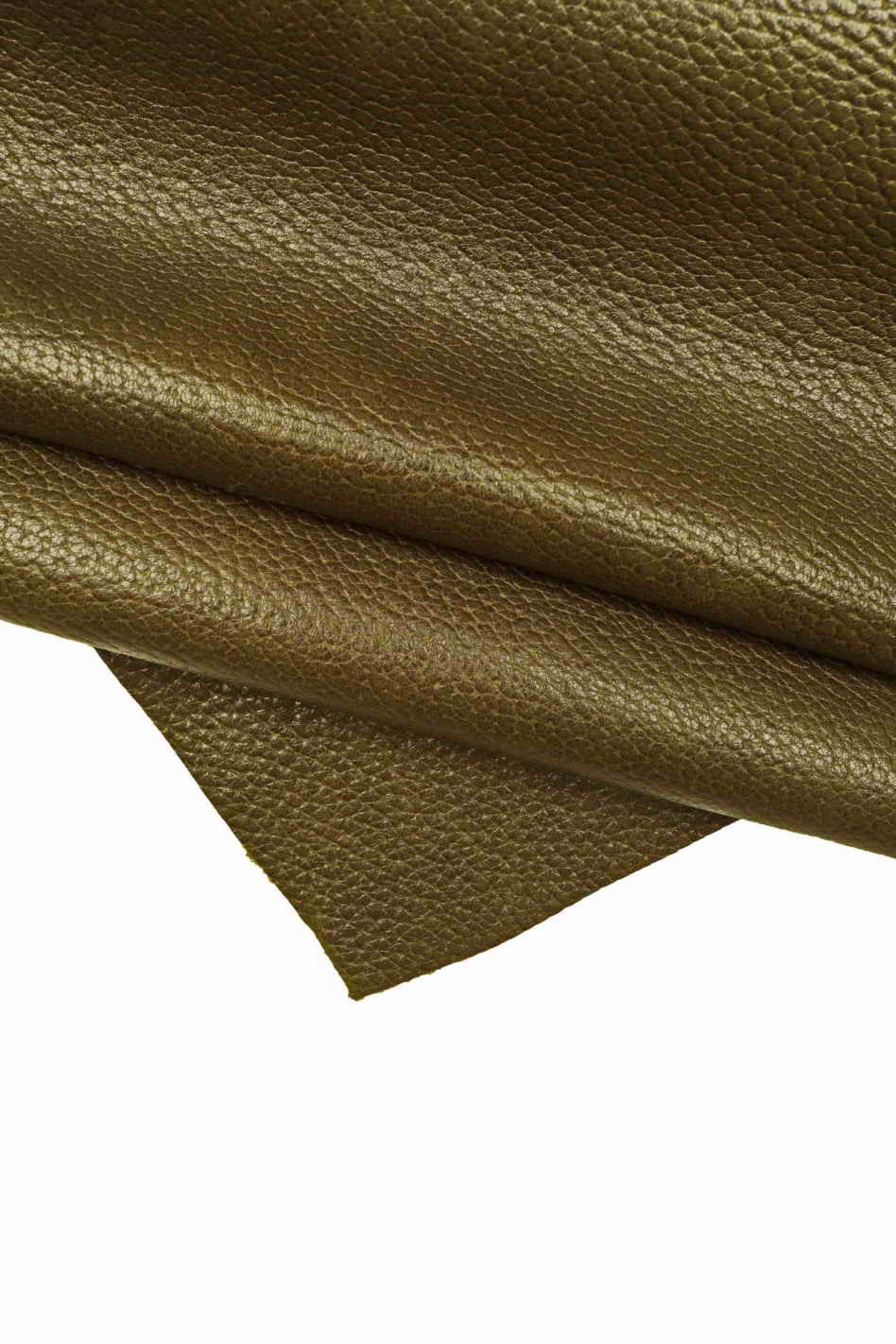 Favoloso pellame di vitello marrone verdastro con grana stampata, morbido, semi lucido.