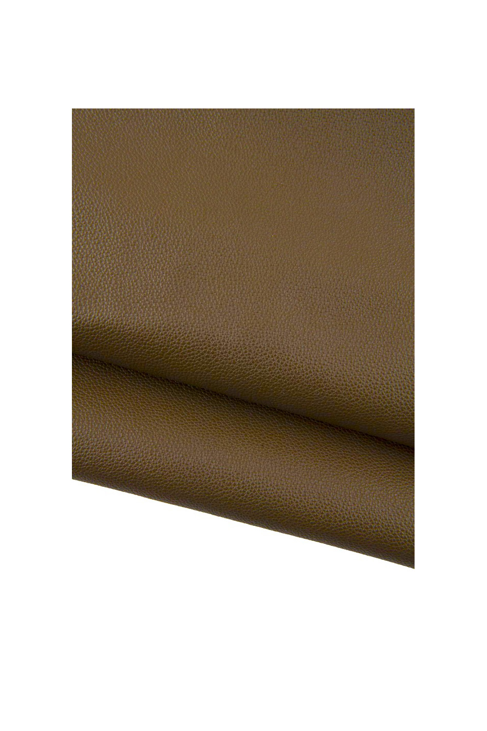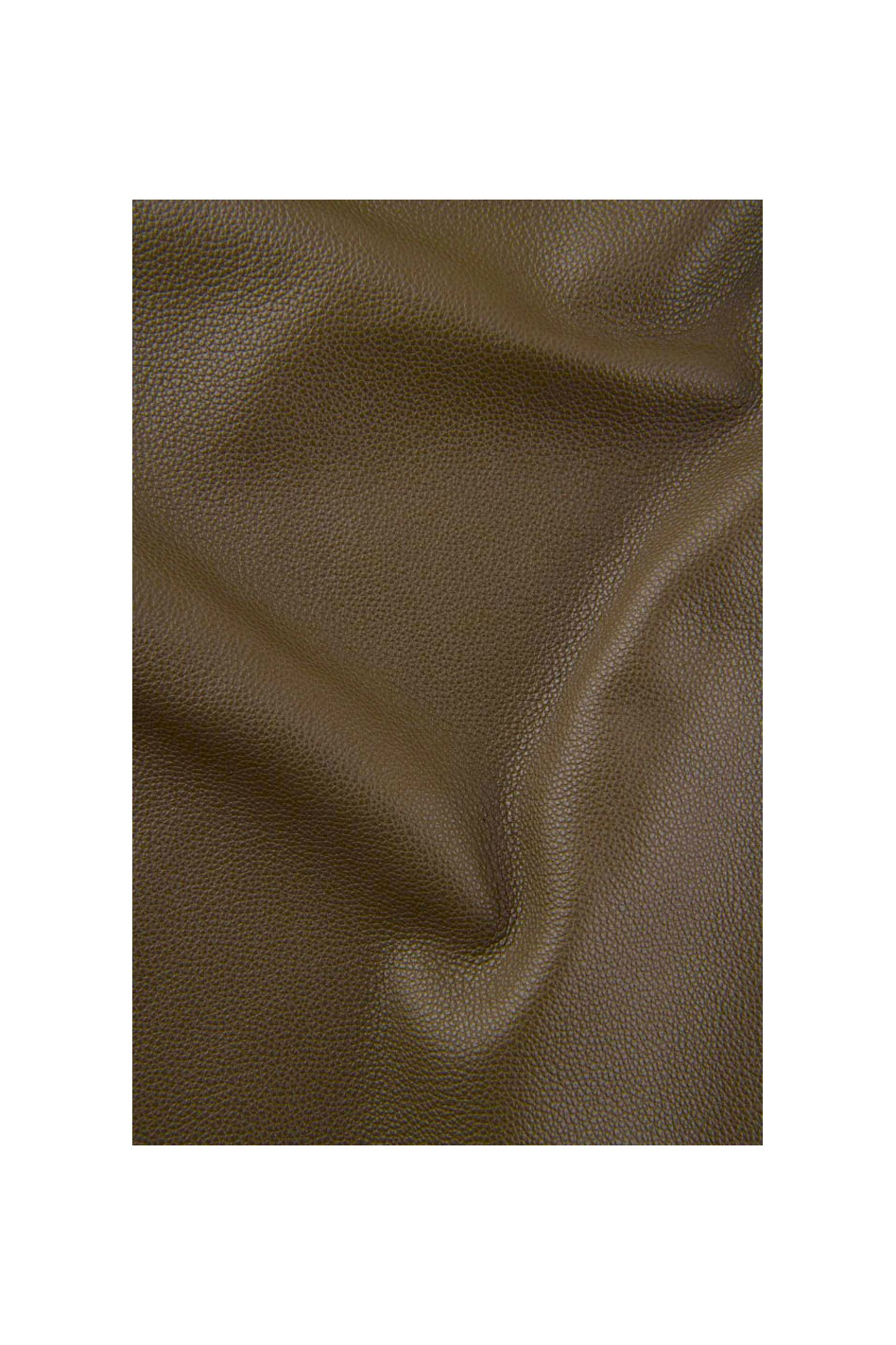 Incredibile pelle di vitello marrone fango tinta unita con grana piccola, semi lucida e classica.