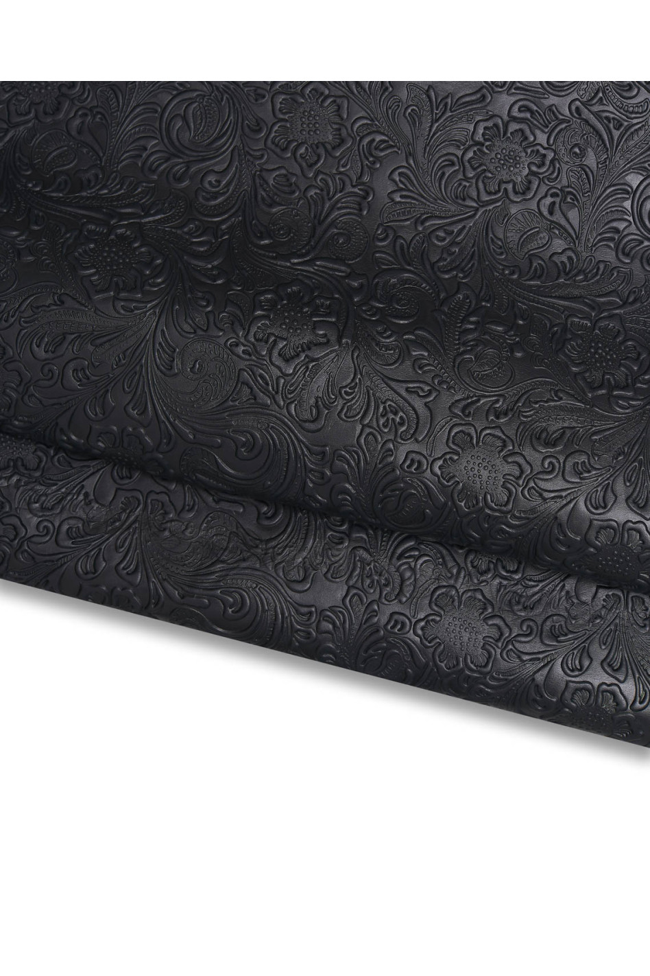 Incredibile pelle di vitello testa di moro/nero con stampa charro floreale in rilievo, morbida e semi lucida, ideale per l'artigianato.