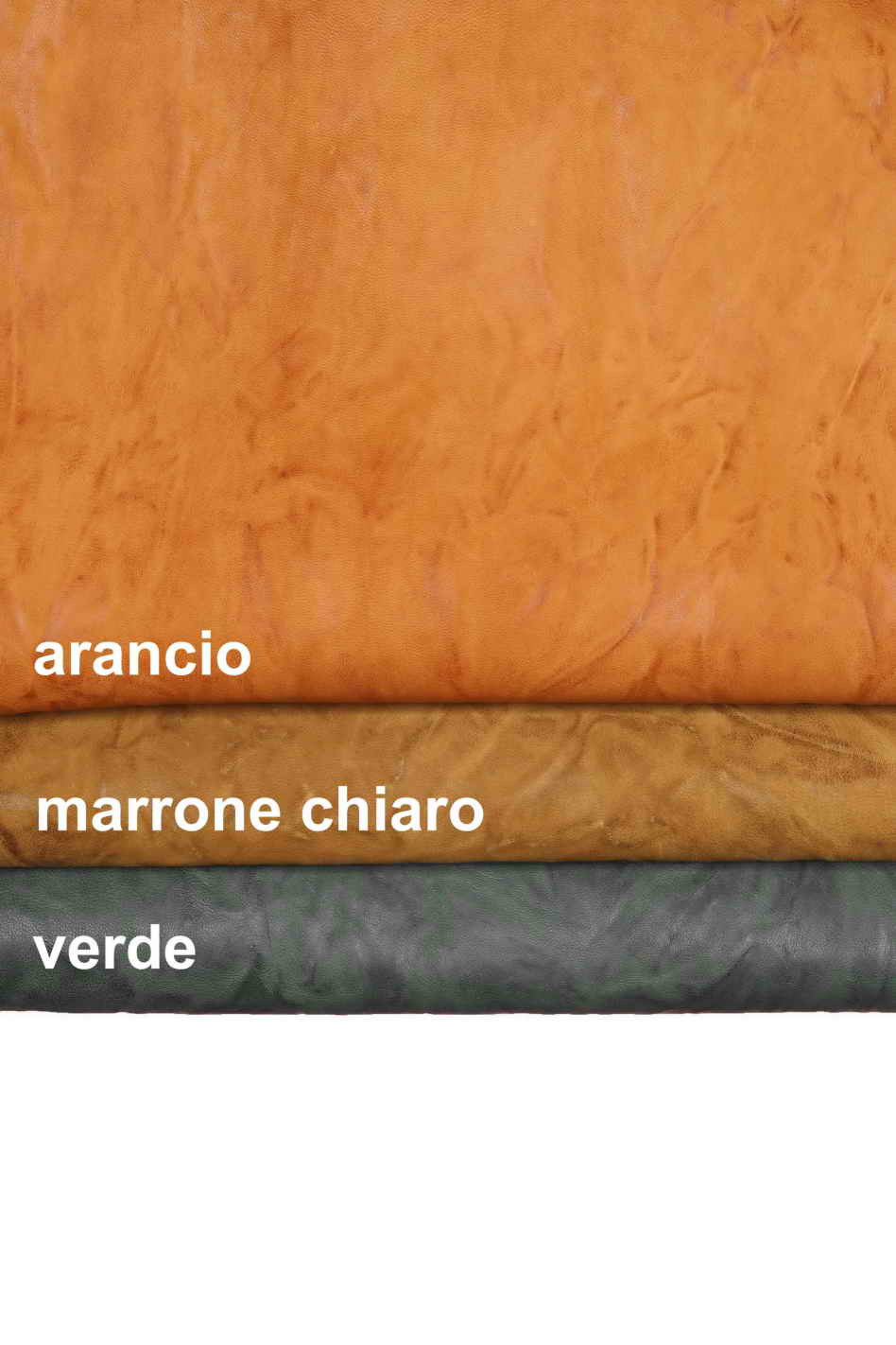 Pelle italiana, nappa vegetale lavata su montone effetto stropicciato, semi lucida, abbastanza morbida, look vintage/sportivo, 3 colori disponibili.