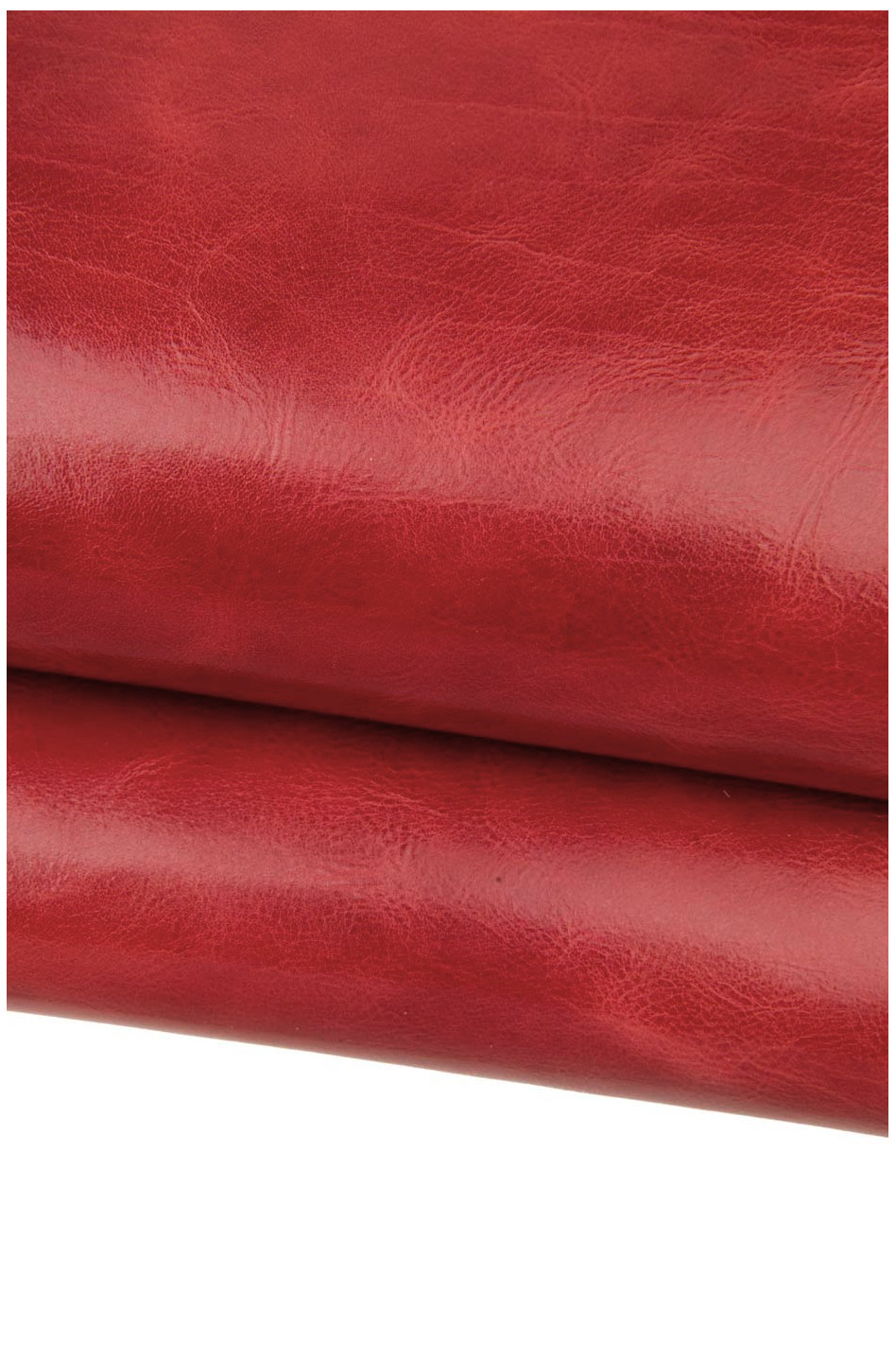 Particolare pelle rosso scuro, vitellino vintage concia vegetale, pellame lucido pull up morbido per artigianato