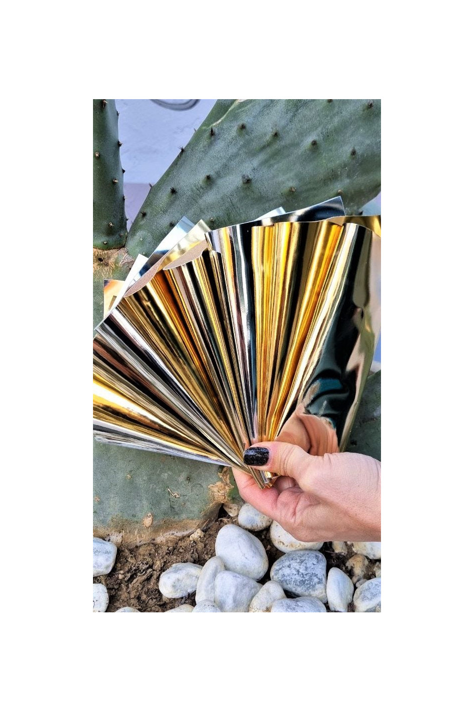 Splendidi ritagli, mix di scampoli di pellami laminati specchio sui toni argento, oro e platino.