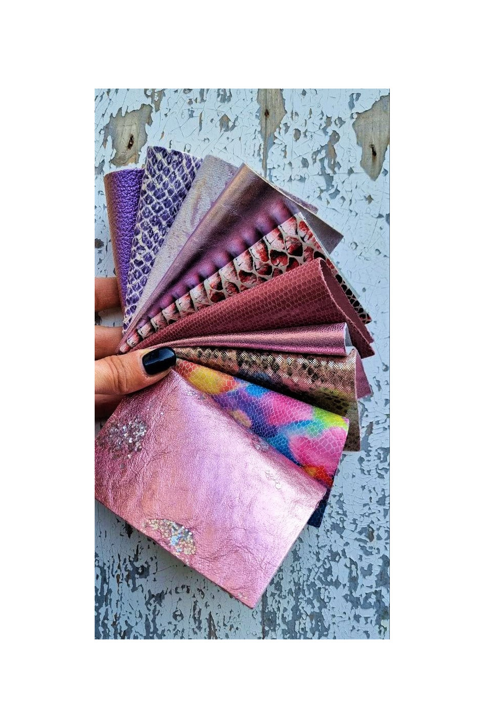10 Ritagli di pellami unici selezionati, stampati sui toni del ROSA e VIOLA, pezzi pretagliati mix di fantasie come da foto