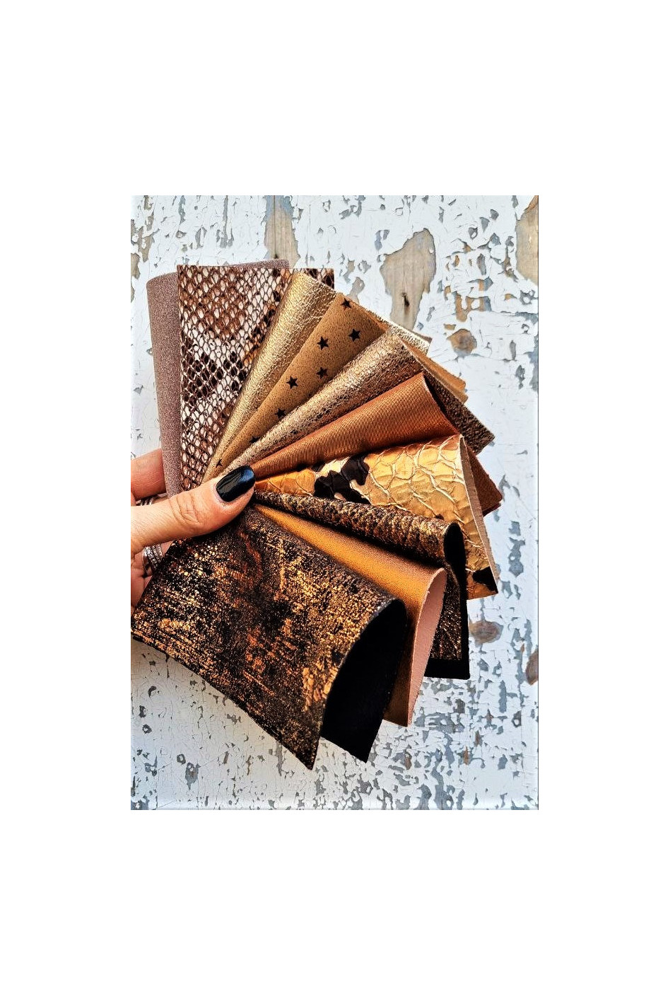 10 pezzi di piccole dimensioni pretagliati di pelle miste fantasia colori sabbia, marrone e bronzo con stampe, lamine e morbidezze differenti, look sportivo/raffinato. Ritagli di vera pelle italiana. Dimensioni minime di 15 x 12 cm e 7,5 x 7,5 cm