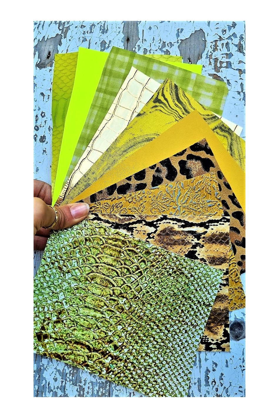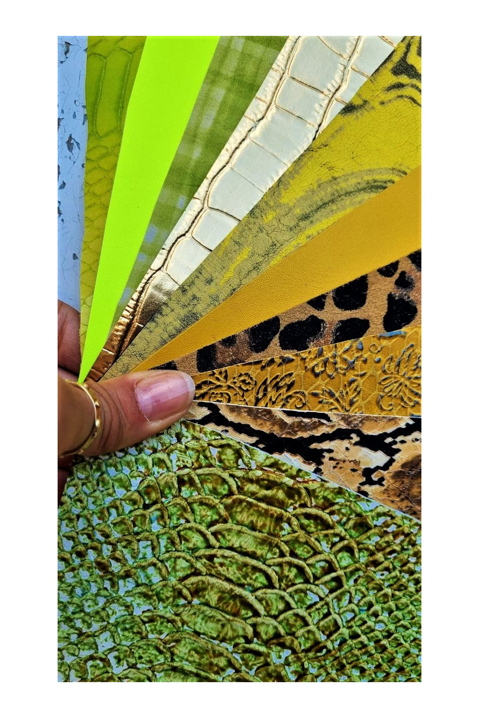 10 Ritagli di pellami unici selezionati, laminati, stampati, VERDE e GIALLO, pezzi di pelle mix fantasie come da foto