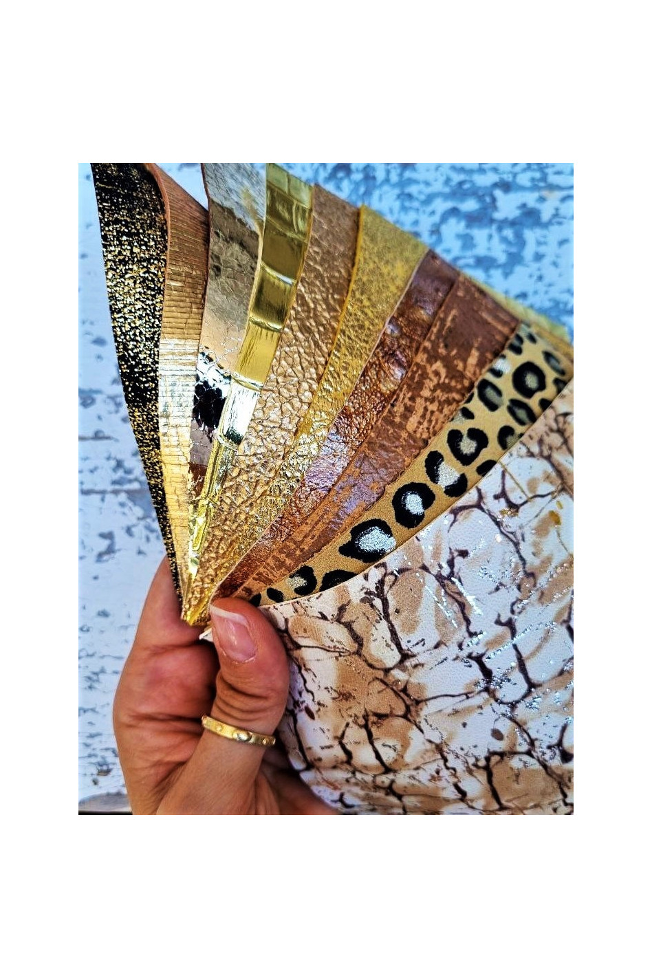 10 Ritagli di pellami unici selezionati, laminati e stampati, ORO, BEIGE e MARRONE, pezzi di pelle mix fantasie come da foto