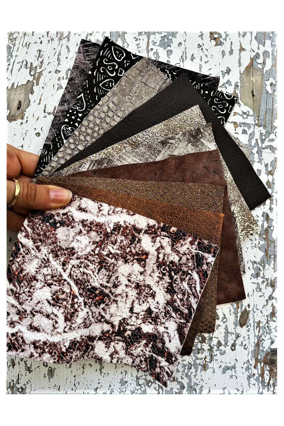 10 Ritagli di pellami unici LAMINATI STAMPATI nei toni del marrone, pezzi di pelle mix fantasie come da foto