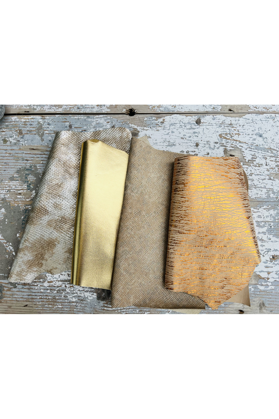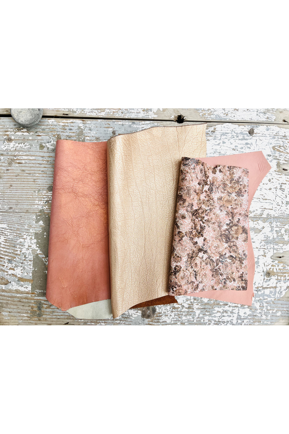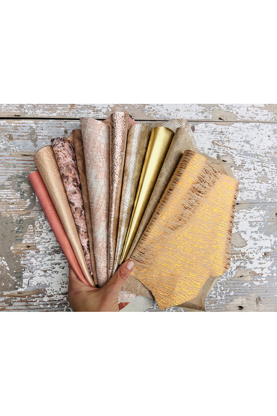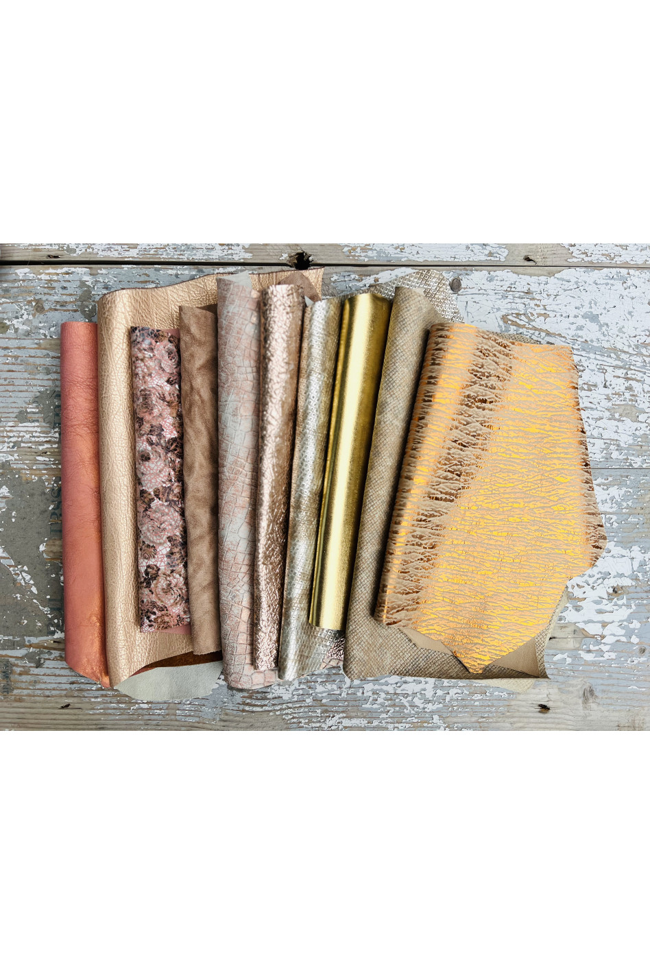 10 pezzi di pelle miste fantasia con stampe, lamine, colori e morbidezza differenti, look sportivo/raffinato nei toni rosa e platino. Ritagli di vera pelle italiana. Dimensioni minime di 25 x 20 cm.