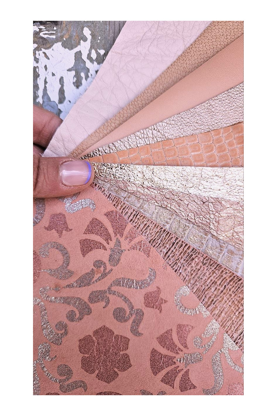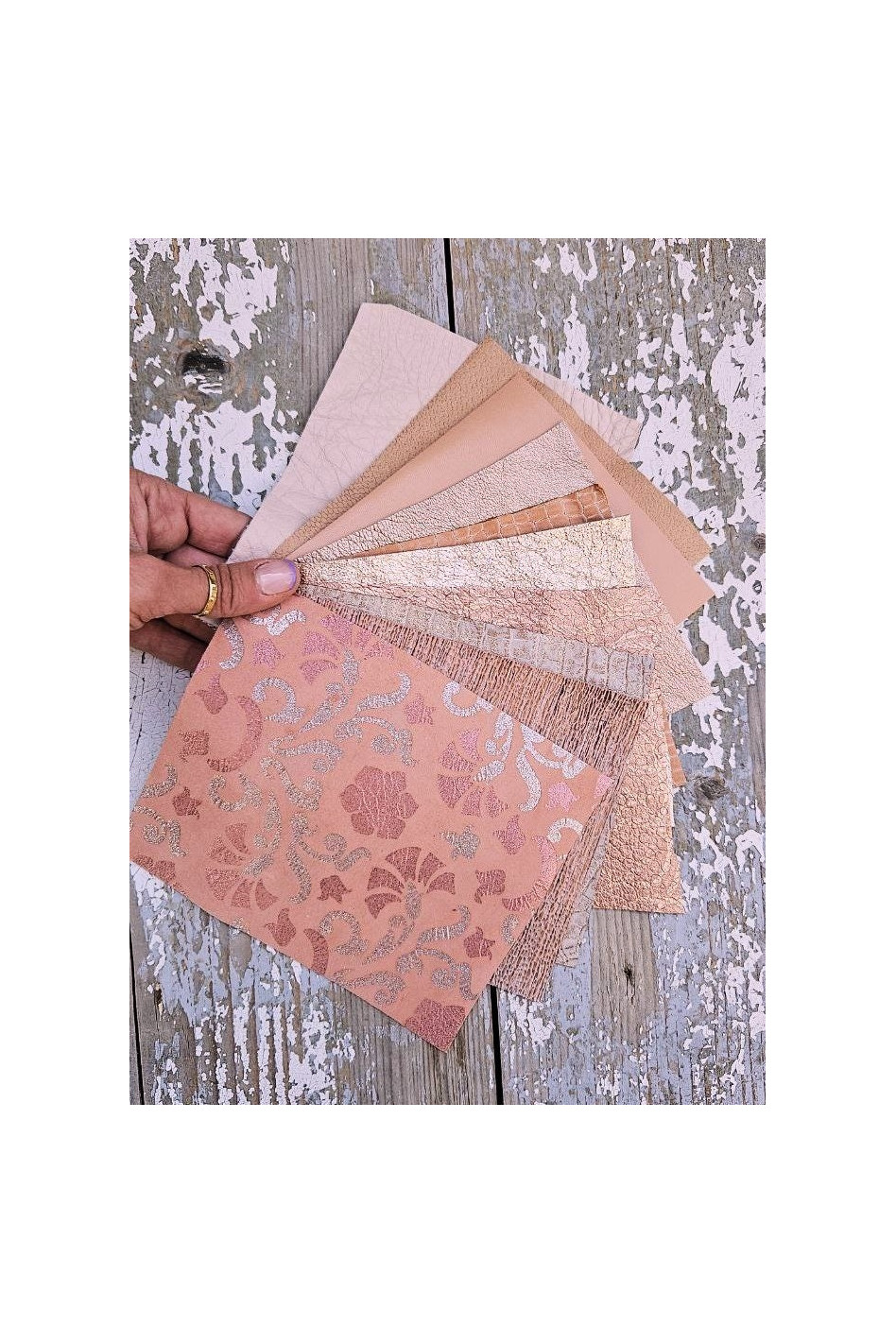 10 pezzi di piccole dimensioni di pelle miste fantasia rosa con stampe, lamine e morbidezze differenti, look sportivo/raffinato. Ritagli di vera pelle italiana. Dimensioni minime di 15 x 12 cm.