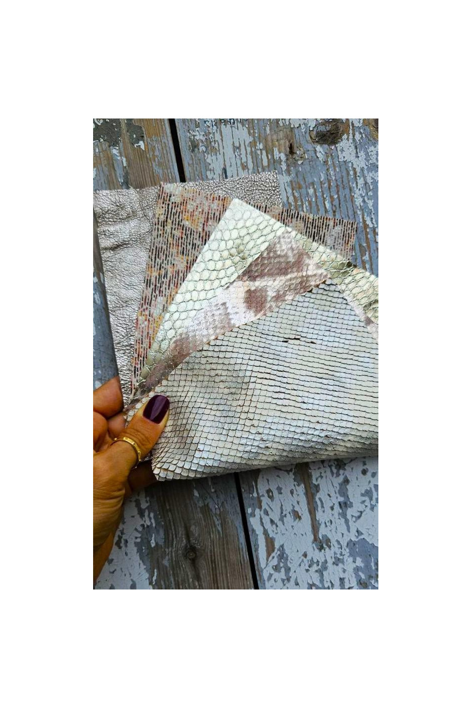 5 Ritagli di pellami unici selezionati, toni PLATINO e ROSA, stampe varie, laminate e non, pezzi mix di fantasie come da foto