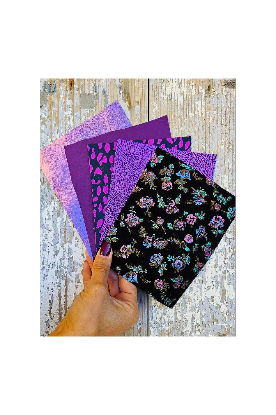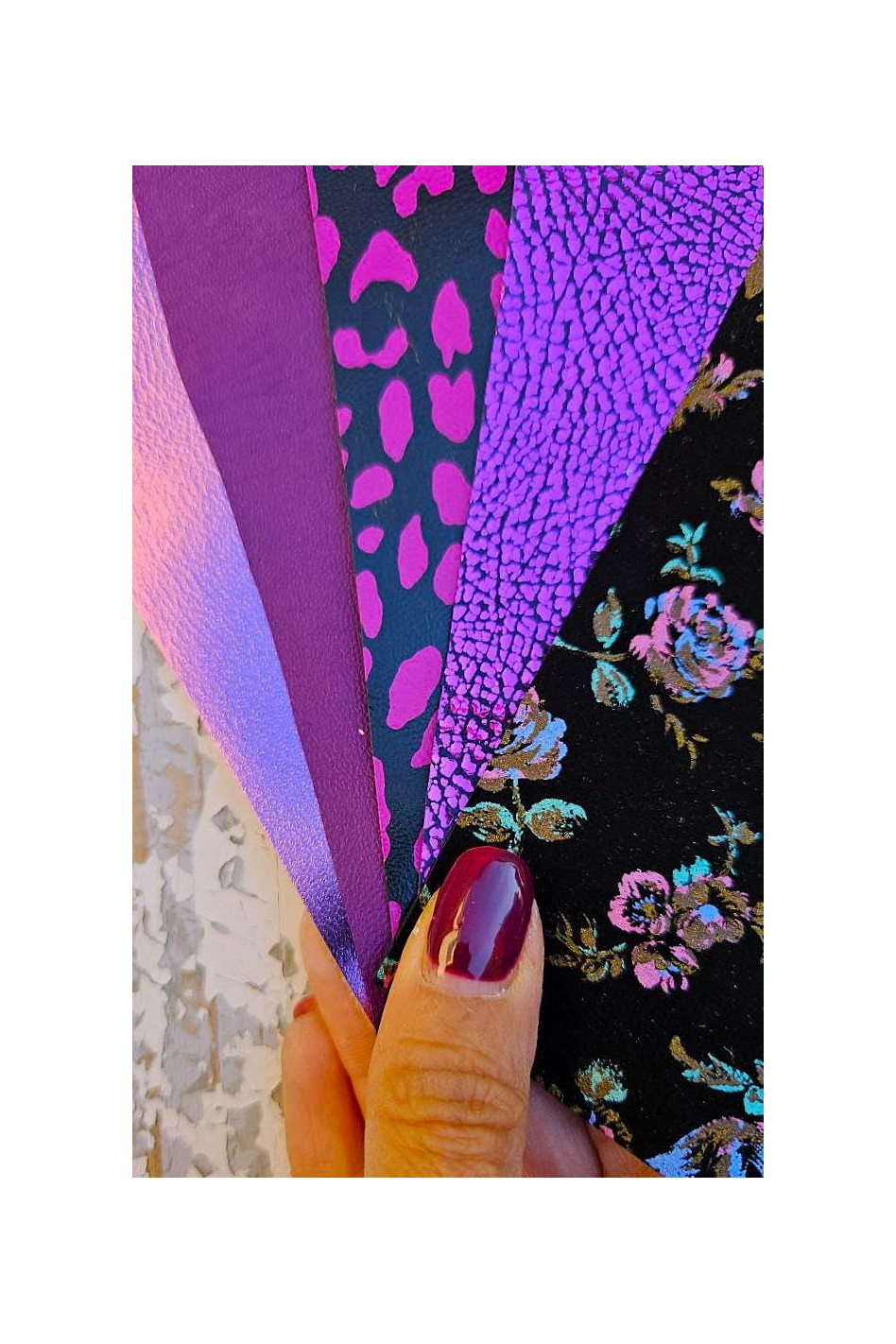 5 Ritagli di pellami unici selezionati, color VIOLA, stampe varie, laminate e non, pezzi mix di fantasie come da foto