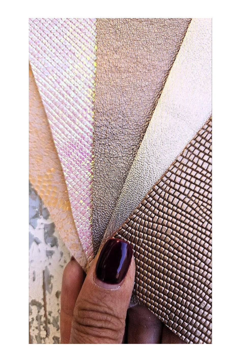 5 Ritagli di pellami unici selezionati, marrone chiaro, rosa e beige, stampe varie, laminate e non, mix di fantasie come da foto