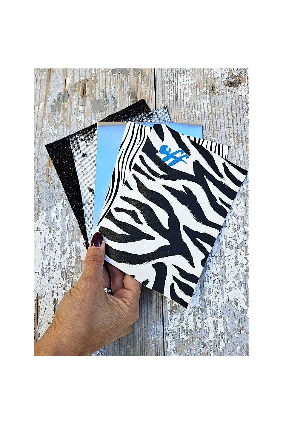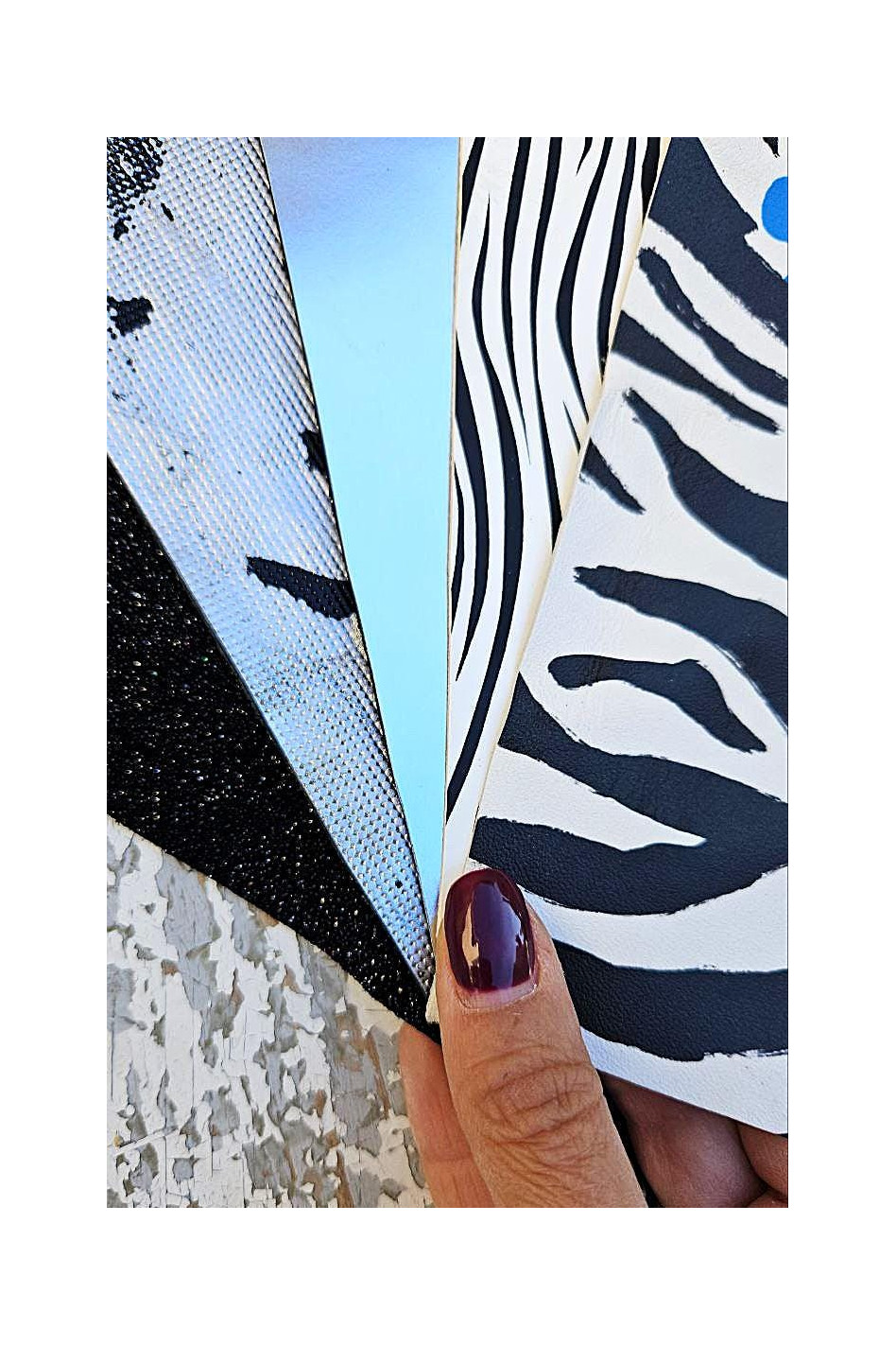 5 Ritagli di pellami unici selezionati, colori BIANCO, NERO, ARGENTO, stampe varie, laminate e non, mix di fantasie come da foto