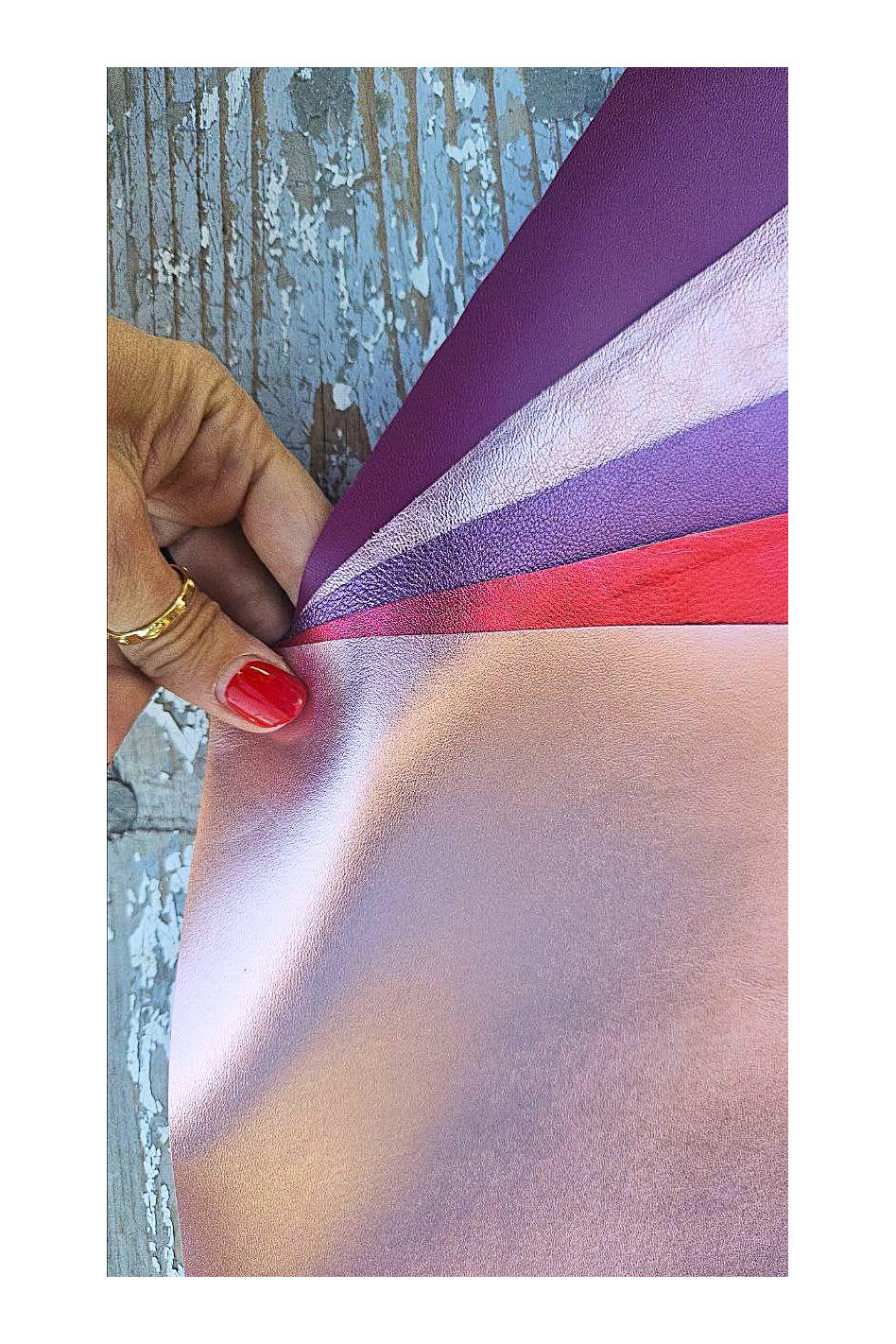 5 pezzi di pelle miste metallizzati e non, lamine in 5 toni diversi e morbidezze differenti, look sportivo/raffinato. Ritagli di vera pelle italiana. Dimensioni minime di 25 x 20 cm.